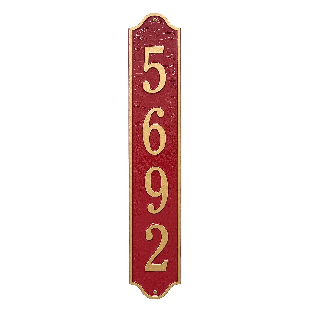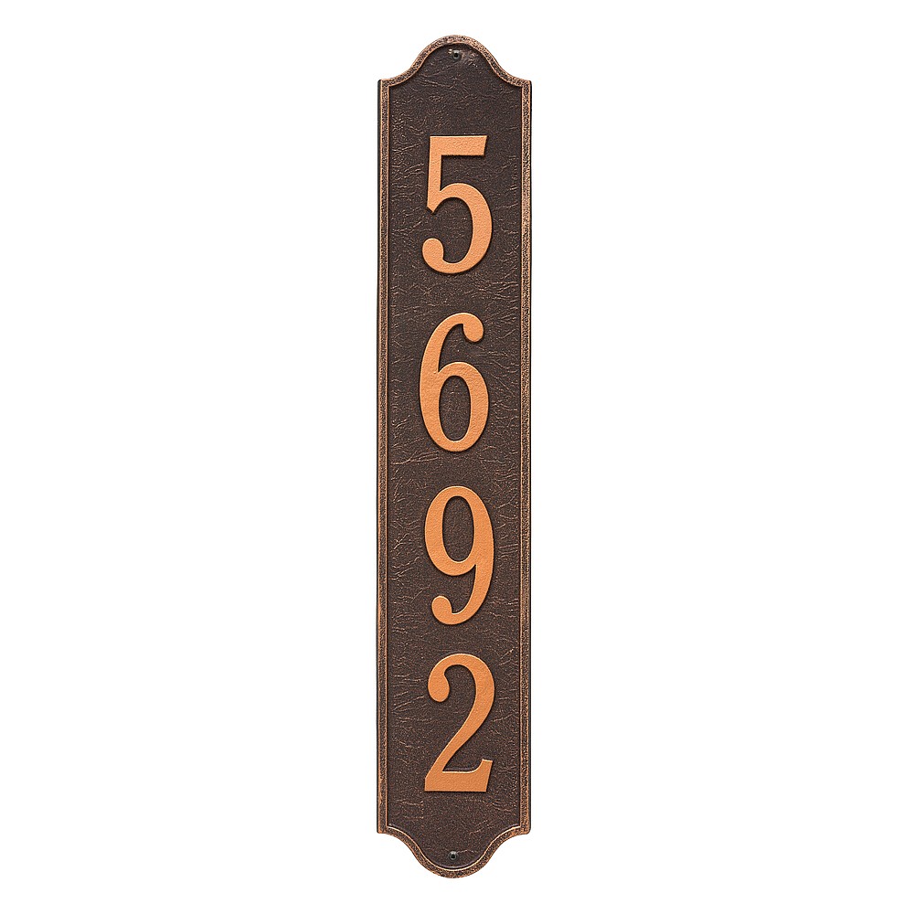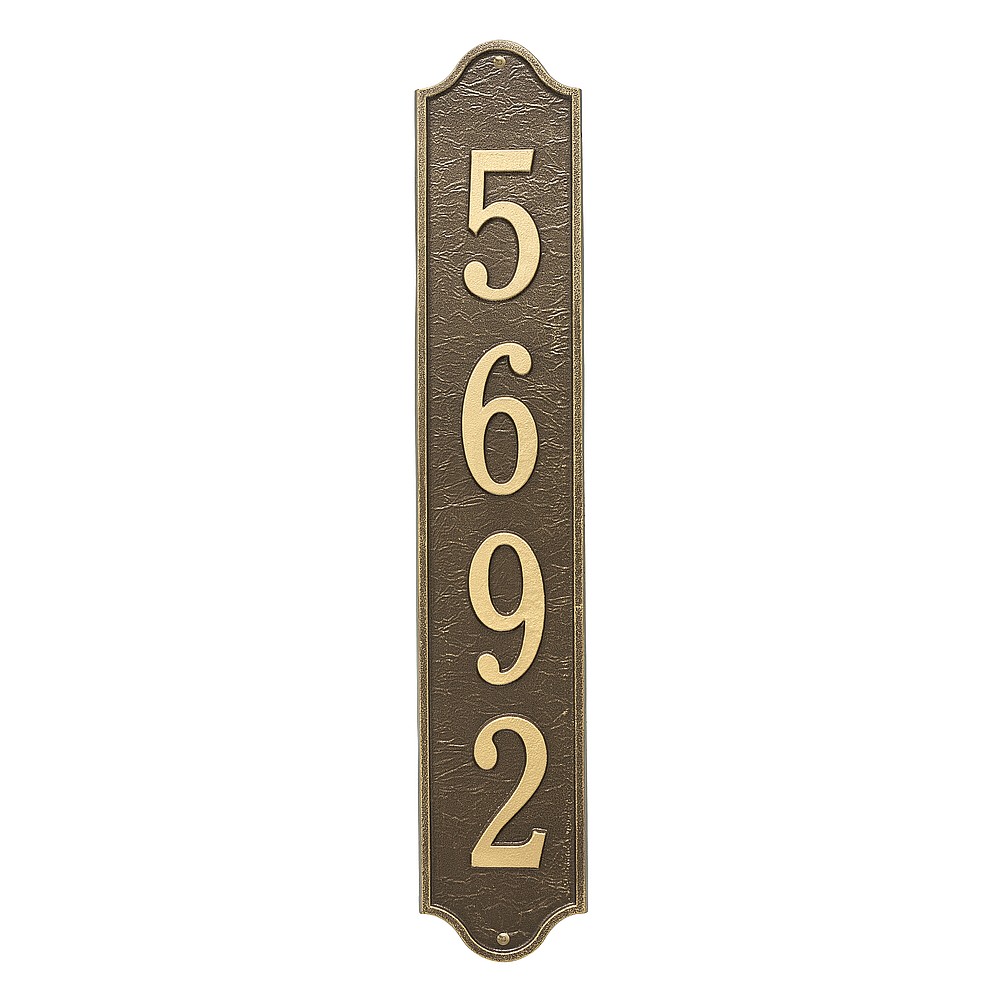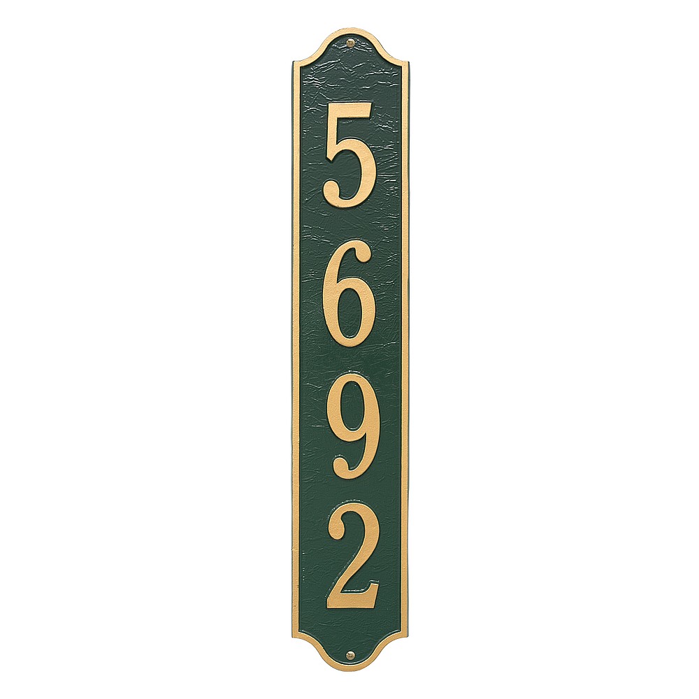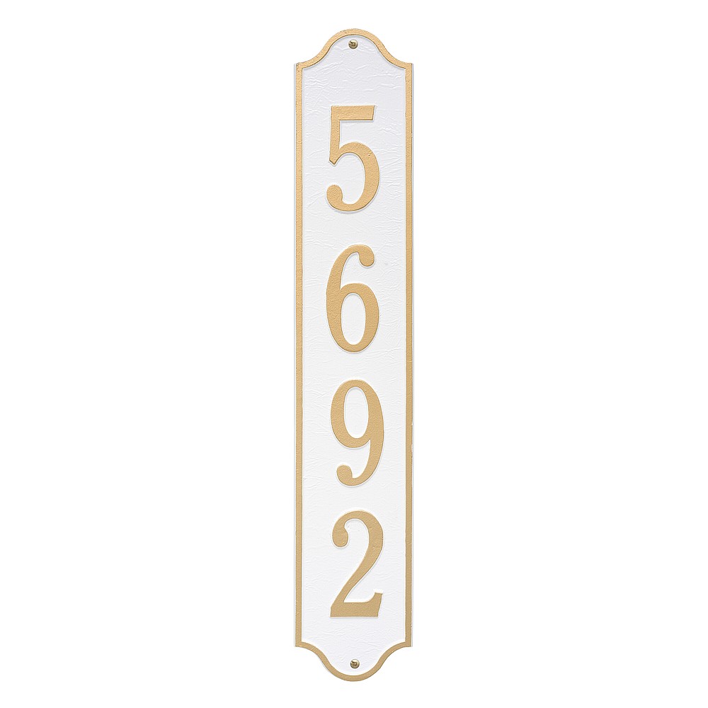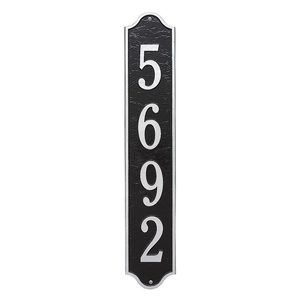 Dimensions (LxWxH): 27.5 x 5 x .375 The Whitehall Products Admiral Vertical Estate Address Plaque will add the finishing touch to your home and instantly improve curb appeal. This address plaque is made from rust-free cast aluminum providing excellent quality and durability. Every Whitehall plaque is hand crafted right here in the USA. Made in the USA Cast from recycled aluminum – will not rust. Alumi-Shieldâ„¢ All Weather Coatings: A Whitehall Exclusive Enhances curb appeal while adding value to your home Personalization is permanently cast into the sign