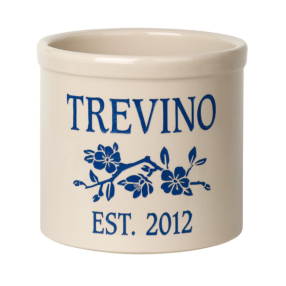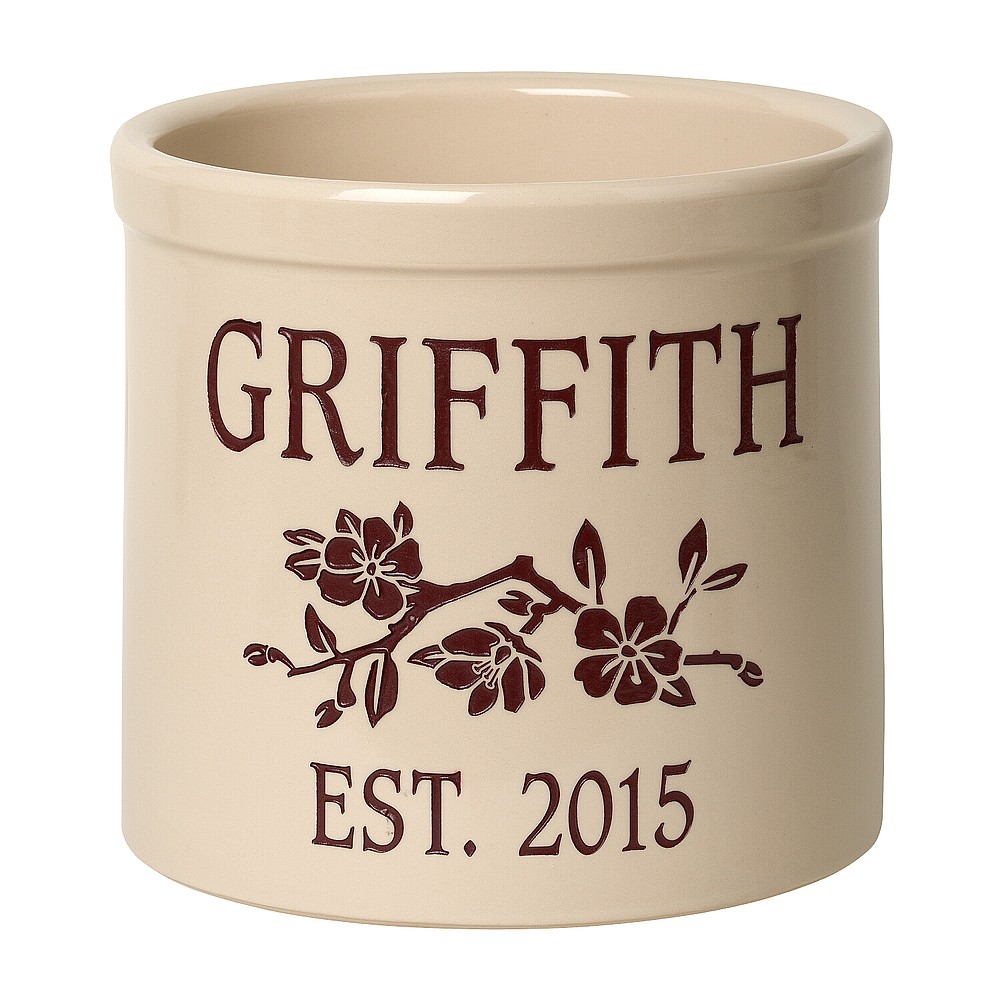 Dimensions (LxWxH): 10″ x 10″ x 9″ Dimensions (LxWxH): 10″ x 10″ x 9″ This personalized dogwood branch established crock is a unique and memorable way to display a couple’s marriage and anniversary date. A Personalized crock is a perfect gift to commemorate all of life’s celebrations. Makes a great personalized wedding, anniversary, or house warming gift. Handcrafted in the USA from premium Tennessee clay, then protected with a lead free glaze. The dogwood brand is a permanent part of the design. Detailed design and personalization is deeply carved and then hand painted in weather resistant finishes. Made in the USA. A Personalized crock is a perfect gift to commemorate all of life’s celebrations. Makes a great personalized wedding, anniversary, or house warming gift. Handcrafted in the USA from premium Tennessee clay, then protected with a lead free glaze. The dogwood brand is a permanent part of the design. Detailed design and personalization is deeply carved and then hand painted in weather resistant finishes. Made in the USA.