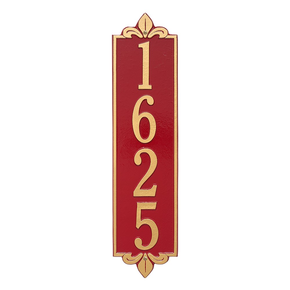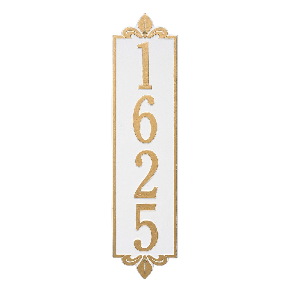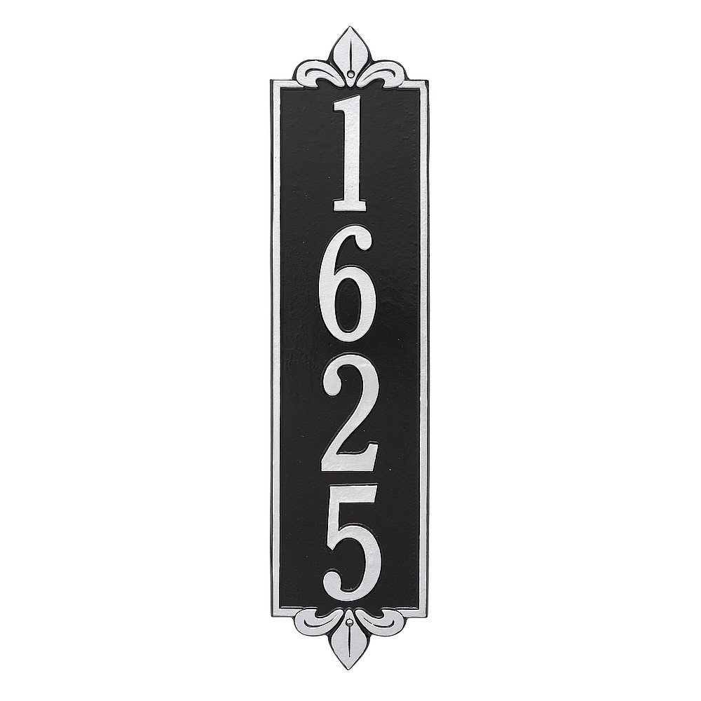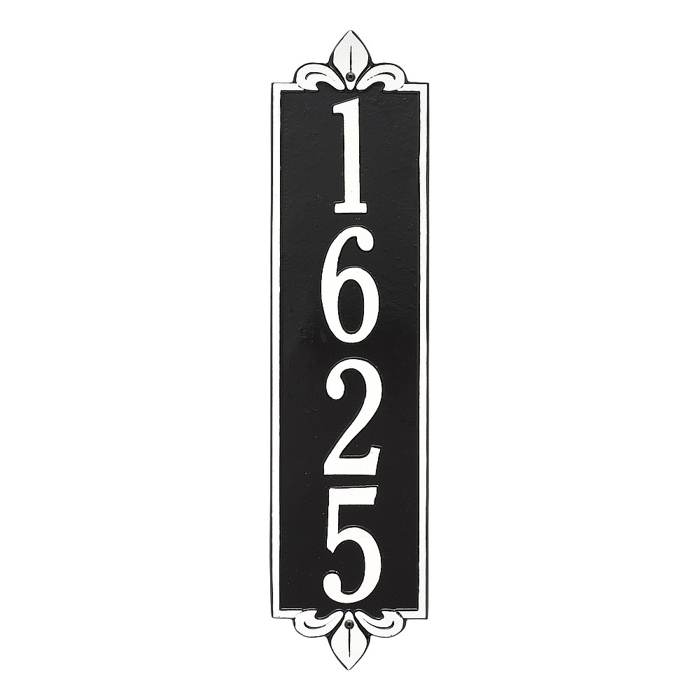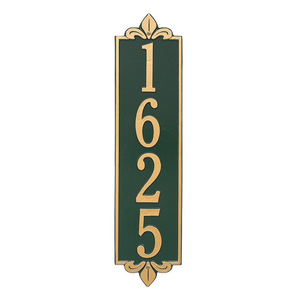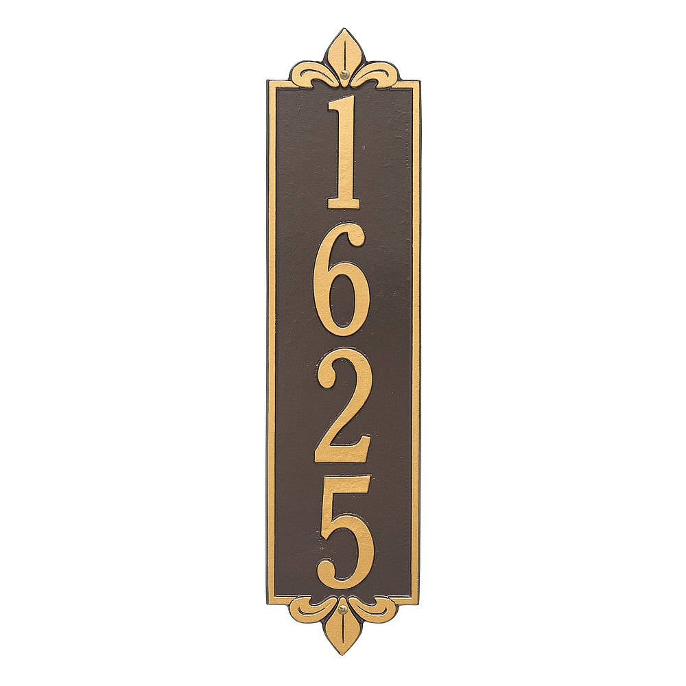 Dimensions (LxWxH): 25 x 6 x .375 The Whitehall Products Lyon Vertical Address Plaque will add the finishing touch to your home and instantly improve curb appeal. This address plaque is made from rust-free cast aluminum providing excellent quality and durability. Made in the USA Cast from recycled aluminum – will not rust. Alumi-Shield™ All Weather Coatings: A Whitehall Exclusive Enhances curb appeal while adding value to your home Personalization is permanently cast into the sign