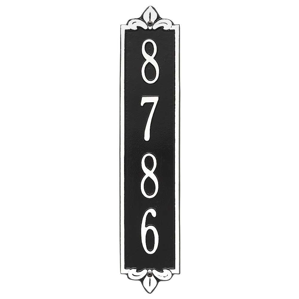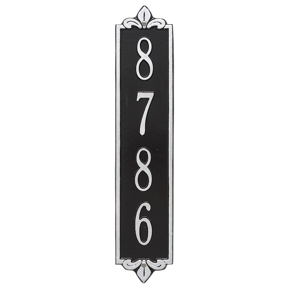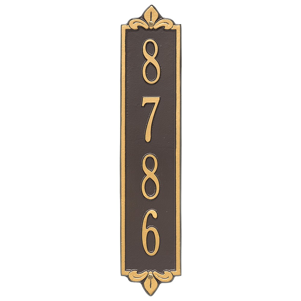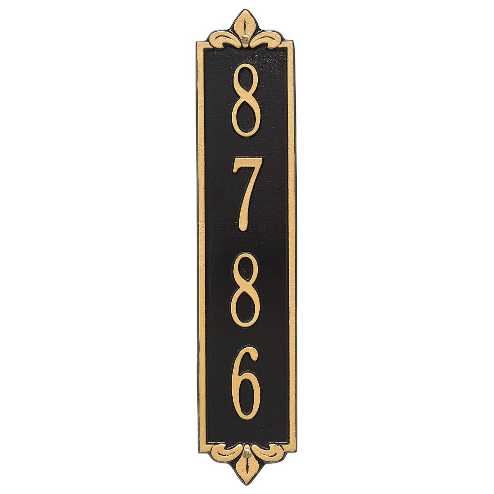 Dimensions (LxWxH): 19 x 4 x .375 The Whitehall Products Lyon Vertical Address Plaque will add the finishing touch to your home and instantly improve curb appeal. This address plaque is made from rust-free cast aluminum providing excellent quality and durability. Made in the USA Cast from recycled aluminum – will not rust. Alumi-Shield™ All Weather Coatings: A Whitehall Exclusive Enhances curb appeal while adding value to your home Personalization is permanently cast into the sign