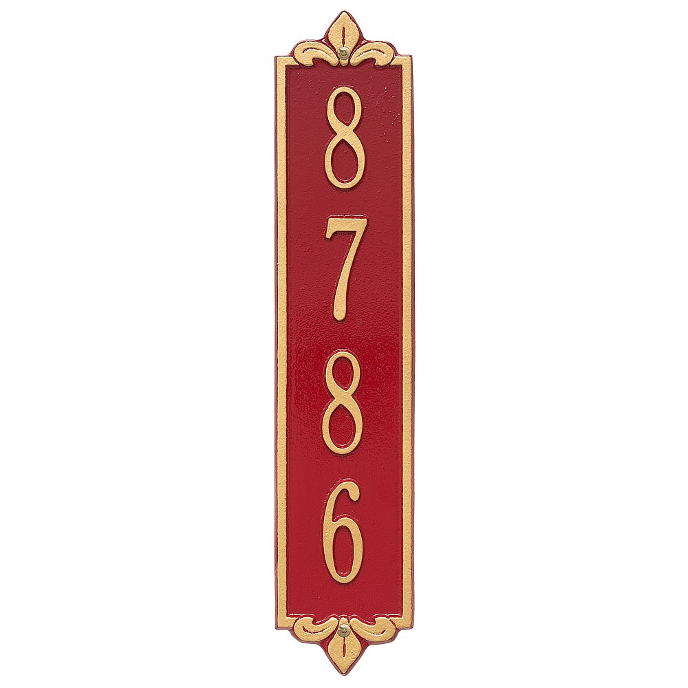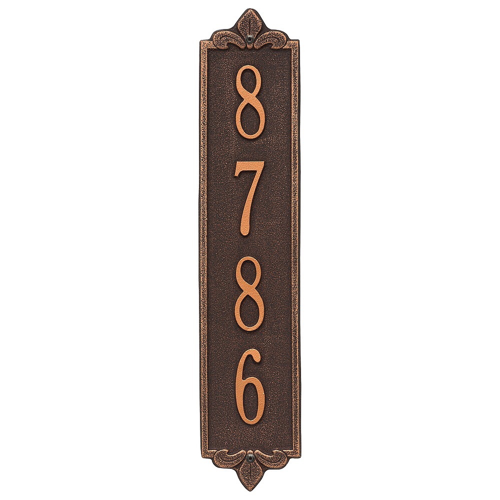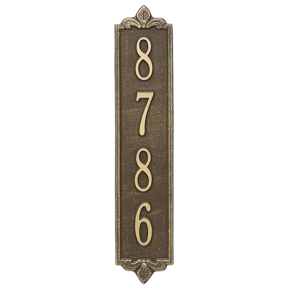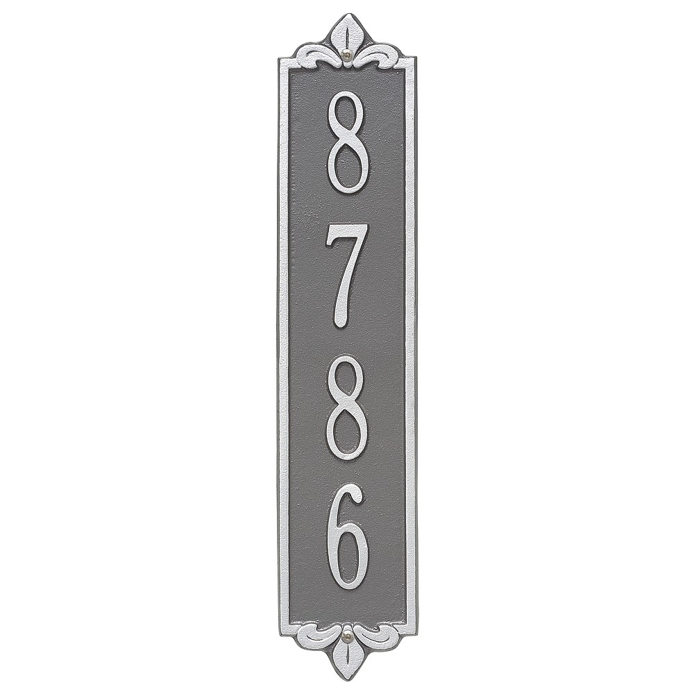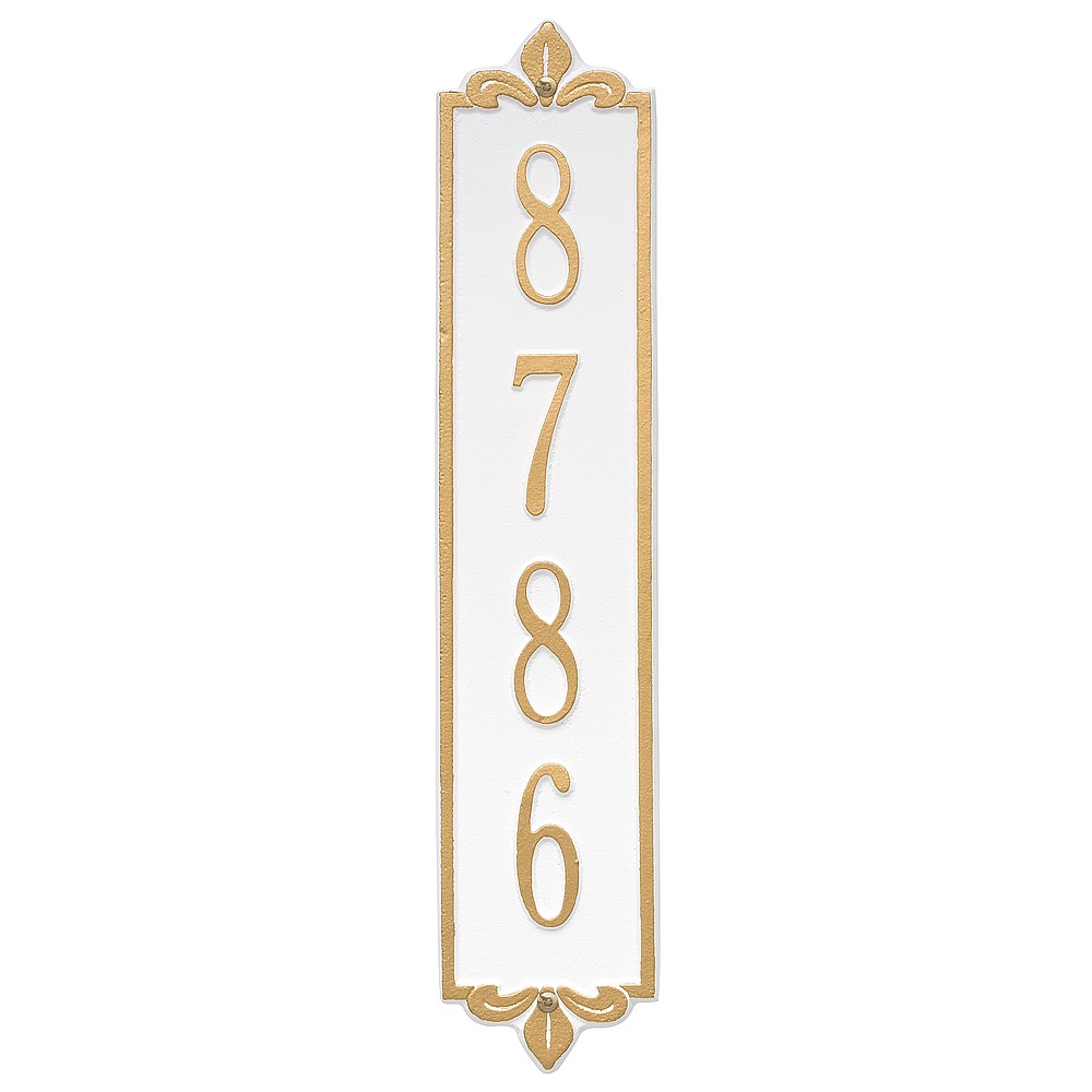 Dimensions (LxWxH): 19 x 4 x .375 The Whitehall Products Lyon Vertical Address Plaque will add the finishing touch to your home and instantly improve curb appeal. This address plaque is made from rust-free cast aluminum providing excellent quality and durability. Made in the USA Cast from recycled aluminum – will not rust. Alumi-Shield™ All Weather Coatings: A Whitehall Exclusive Enhances curb appeal while adding value to your home Personalization is permanently cast into the sign