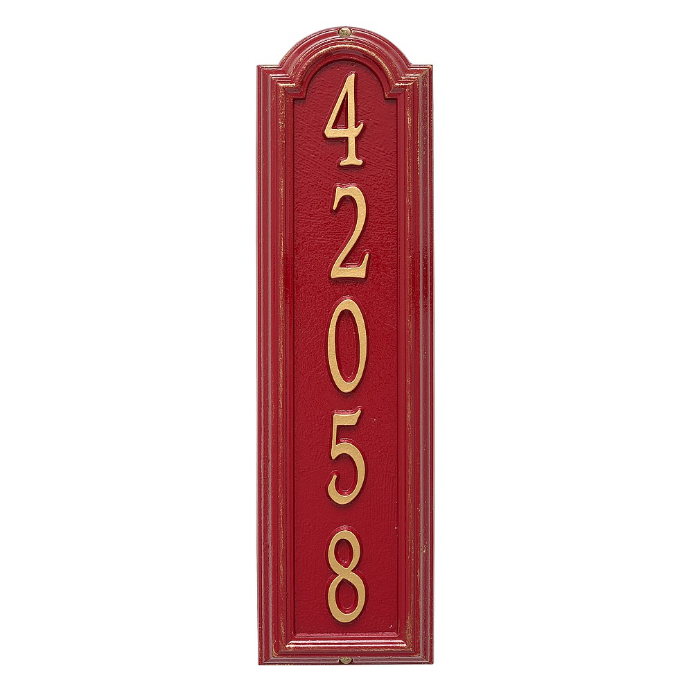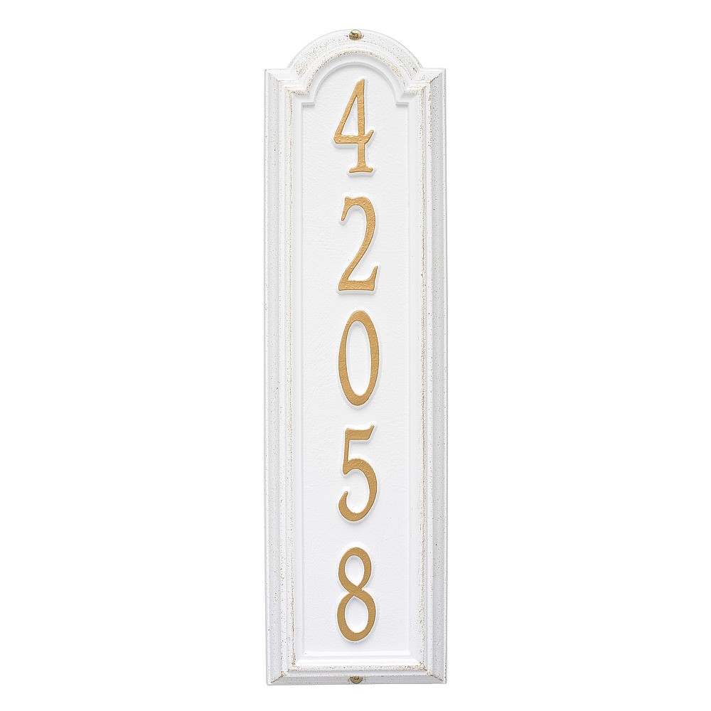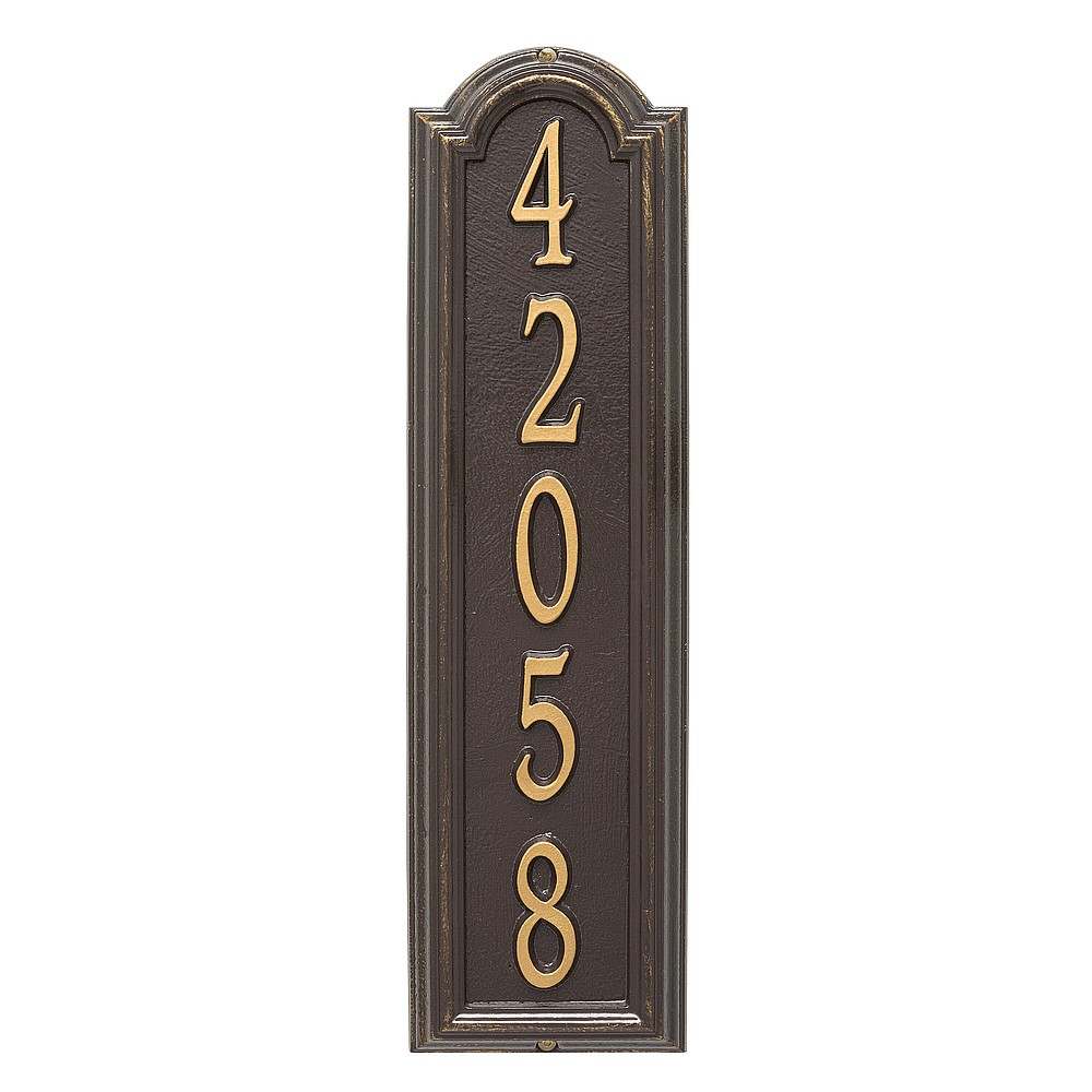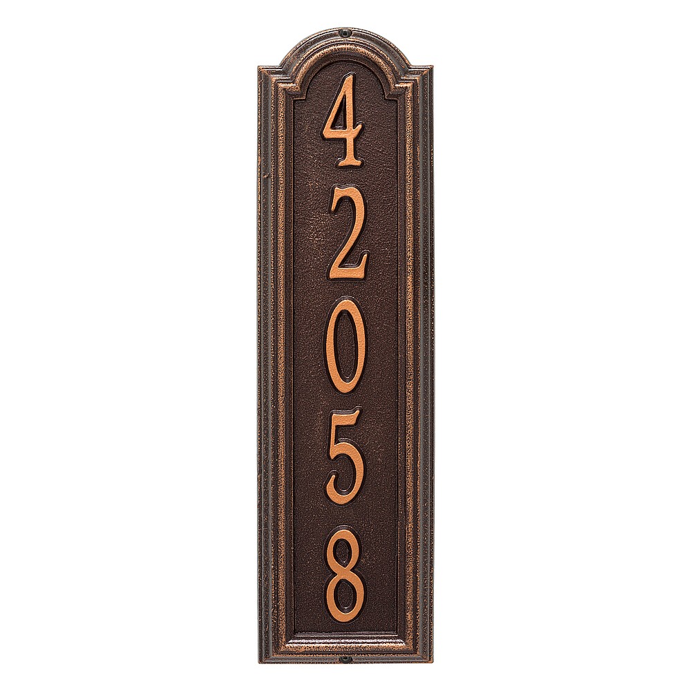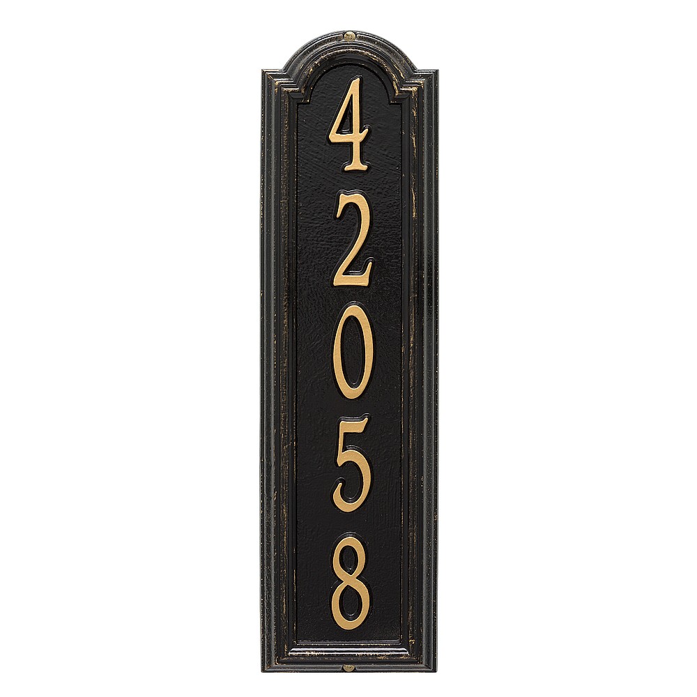 Dimensions (LxWxH): 21 x 5.75 x 1.25 The Whitehall Products Manchester Vertical Address Plaque will add the finishing touch to your home and instantly improve curb appeal. This address plaque is made from rust-free cast aluminum providing excellent quality and durability. Made in the USA Cast from recycled aluminum – will not rust. Alumi-Shield™ All Weather Coatings: A Whitehall Exclusive Enhances curb appeal while adding value to your home Personalization is permanently cast into the sign