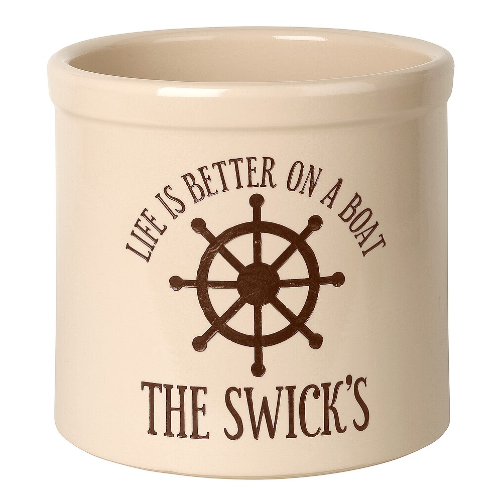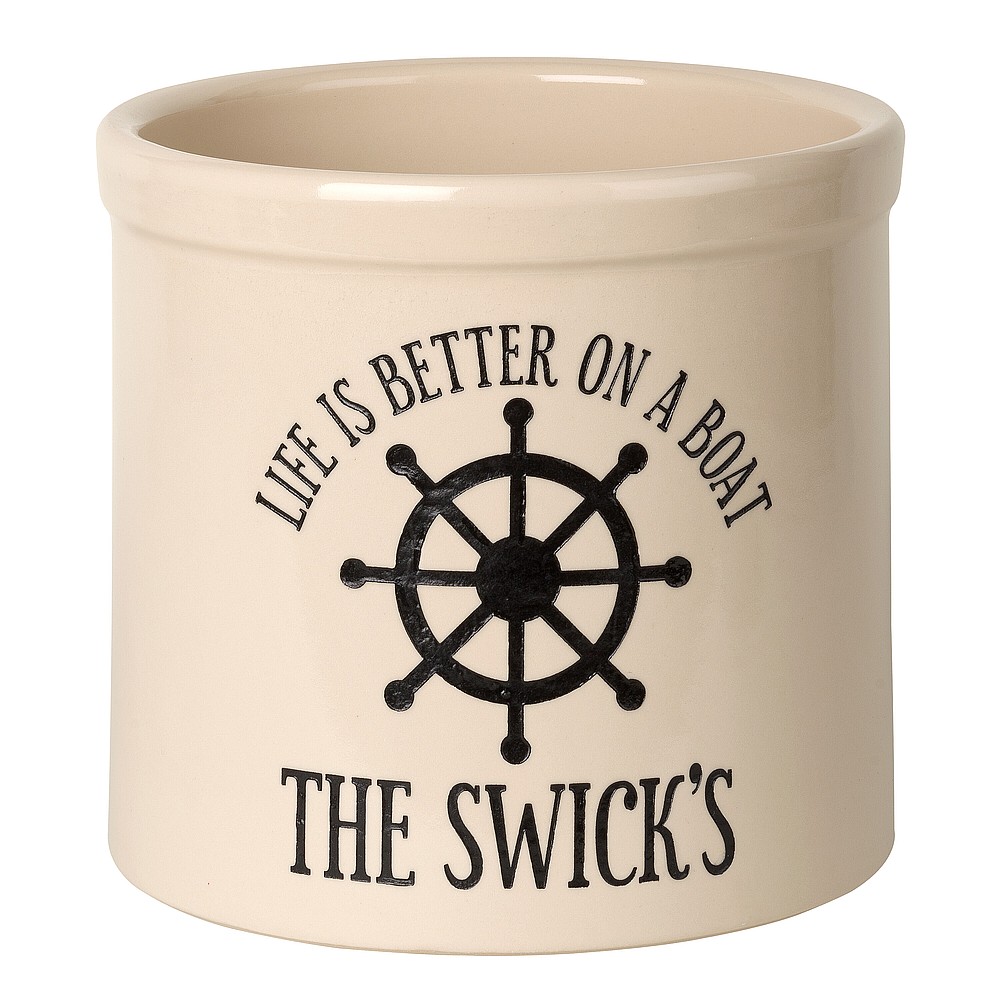 Assembled Dimensions (LxWxH): 9.75″ x 9.75″ x 9″ Whether your planting herbs and flowers, storing kitchen utensils or chilling beverages for a weekend gathering, these versatile two-gallon crocks are practical and personal adding a welcome addition to any abode. We will expertly carve your message to the surface of the crock, making a unique family heirloom that will be cherished through the years. Ideal uses: planter, ice bucket, door stop, magazine holder, utensil holder, house marker the possibilities are endless! Thoughtful and affordable solution for housewarming, wedding or anniversary gifts. Give your entryway a little personality when you use this personalized crock as a planter. Made-to-order, each of the crocks detailed design and personalization is deeply carved and then hand-painted with weather resistant finishes and glaze. Suitable for both indoor and outdoor use. Handcrafted in the USA from substantial and sturdy stoneware. A timeless piece to last for generations. Two-gallon, oversized crocks accommodate sizeable amounts of goods for storage. Crocks weigh a substantial 12 lbs., making for sturdy and durable storability. Hand wash. Avoid freezing.