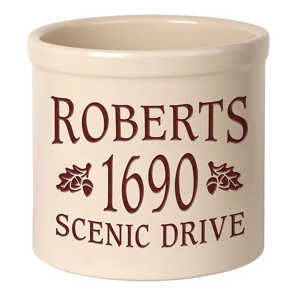 Assembled Dimensions (LxWxH): 9.75″ x 9.75″ x 9″ Whether your planting herbs and flowers, storing kitchen utensils or chilling beverages for a weekend gathering, these versatile two-gallon crocks are practical and personal adding a welcome addition to any abode. We will expertly carve your message to the surface of the crock, making a unique family heirloom that will be cherished through the years. Ideal uses: planter, ice bucket, door stop, magazine holder, utensil holder, house marker the possibilities are endless! Thoughtful and affordable solution for housewarming, wedding or anniversary gifts. Give your entryway a little personality when you use this personalized crock as a planter. Made-to-order, each of the crocks detailed design and personalization is deeply carved and then hand-painted with weather resistant finishes and glaze. Suitable for both indoor and outdoor use. Handcrafted in the USA from substantial and sturdy stoneware. A timeless piece to last for generations. Two-gallon, oversized crocks accommodate sizeable amounts of goods for storage. Crocks weigh a substantial 12 lbs., making for sturdy and durable storability. Hand wash. Avoid freezing.