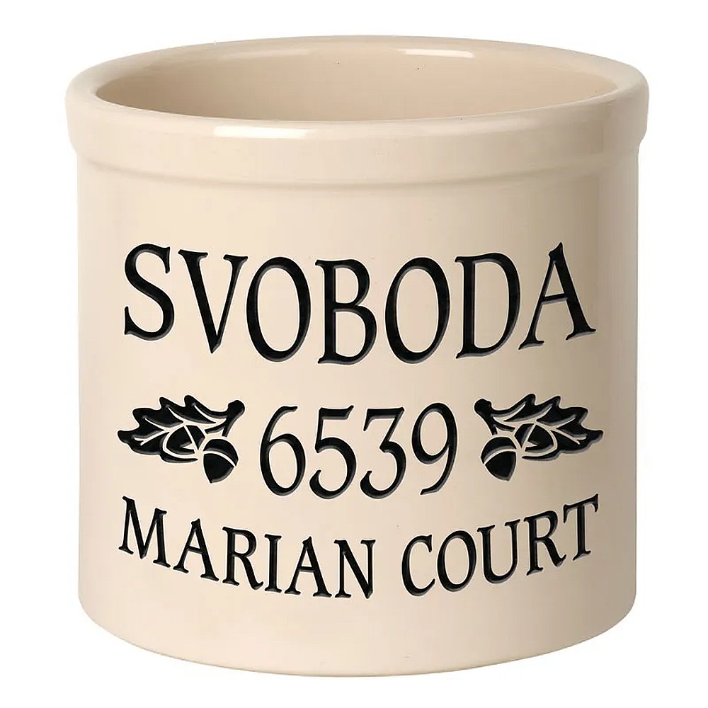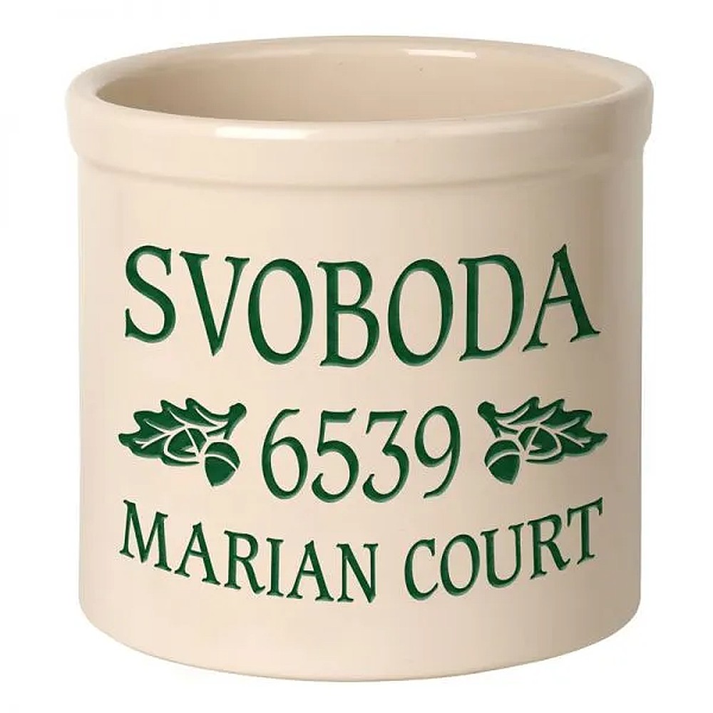 Assembled Dimensions (LxWxH): 9.75″ x 9.75″ x 9″ Whether your planting herbs and flowers, storing kitchen utensils or chilling beverages for a weekend gathering, these versatile two-gallon crocks are practical and personal adding a welcome addition to any abode. We will expertly carve your message to the surface of the crock, making a unique family heirloom that will be cherished through the years. Ideal uses: planter, ice bucket, door stop, magazine holder, utensil holder, house marker the possibilities are endless! Thoughtful and affordable solution for housewarming, wedding or anniversary gifts. Give your entryway a little personality when you use this personalized crock as a planter. Made-to-order, each of the crocks detailed design and personalization is deeply carved and then hand-painted with weather resistant finishes and glaze. Suitable for both indoor and outdoor use. Handcrafted in the USA from substantial and sturdy stoneware. A timeless piece to last for generations. Two-gallon, oversized crocks accommodate sizeable amounts of goods for storage. Crocks weigh a substantial 12 lbs., making for sturdy and durable storability. Hand wash. Avoid freezing.