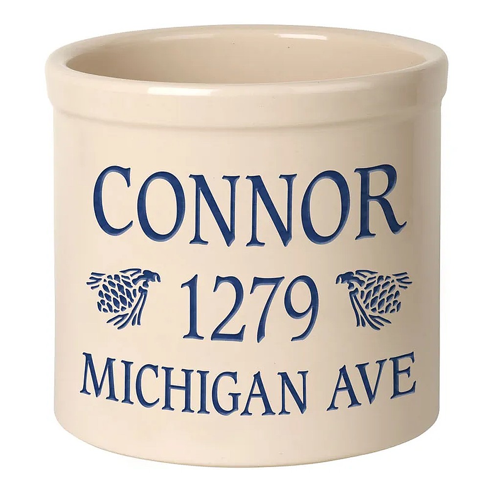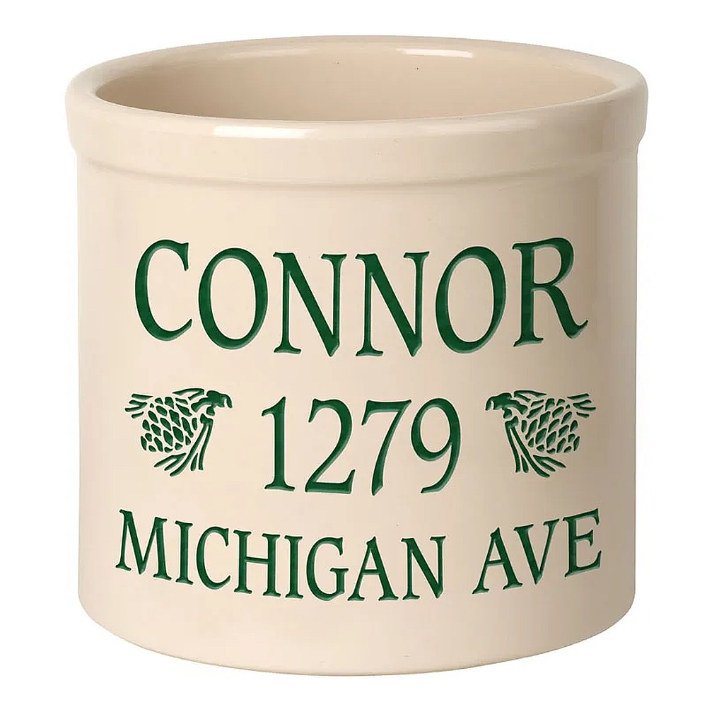Assembled Dimensions (LxWxH): 9.75″ x 9.75″ x 9″ Whether your planting herbs and flowers, storing kitchen utensils or chilling beverages for a weekend gathering, these versatile two-gallon crocks are practical and personal adding a welcome addition to any abode. We will expertly carve your message to the surface of the crock, making a unique family heirloom that will be cherished through the years. Ideal uses: planter, ice bucket, door stop, magazine holder, utensil holder, house marker the possibilities are endless! Thoughtful and affordable solution for housewarming, wedding or anniversary gifts. Give your entryway a little personality when you use this personalized crock as a planter. Made-to-order, each of the crocks detailed design and personalization is deeply carved and then hand-painted with weather resistant finishes and glaze. Suitable for both indoor and outdoor use. Handcrafted in the USA from substantial and sturdy stoneware. A timeless piece to last for generations. Two-gallon, oversized crocks accommodate sizeable amounts of goods for storage. Crocks weigh a substantial 12 lbs., making for sturdy and durable storability. Hand wash. Avoid freezing.
