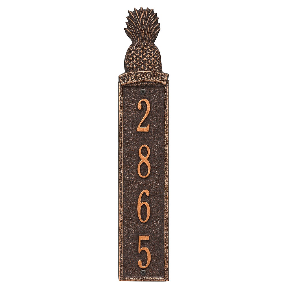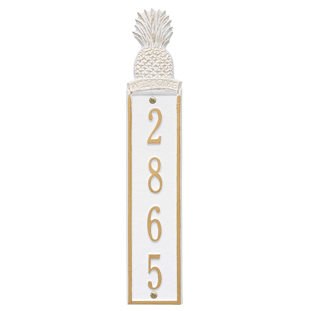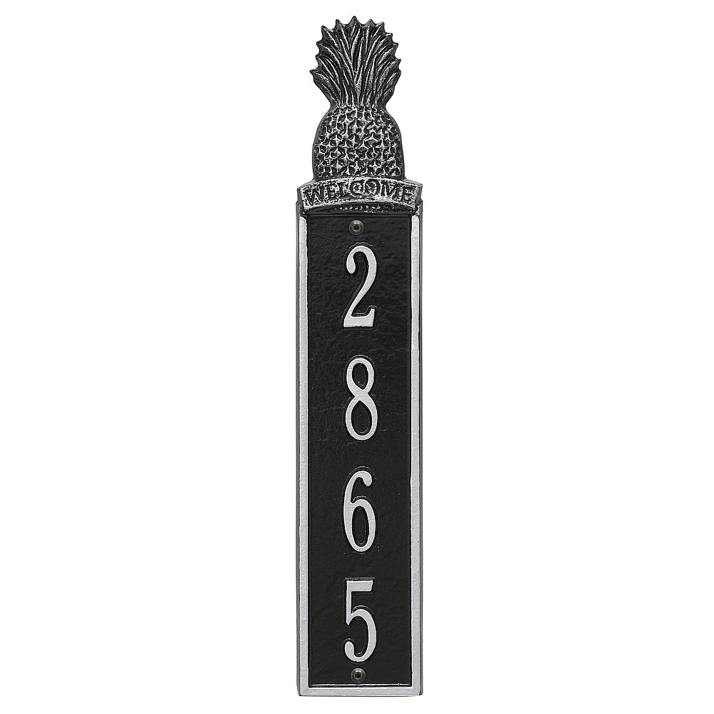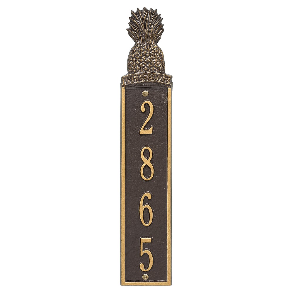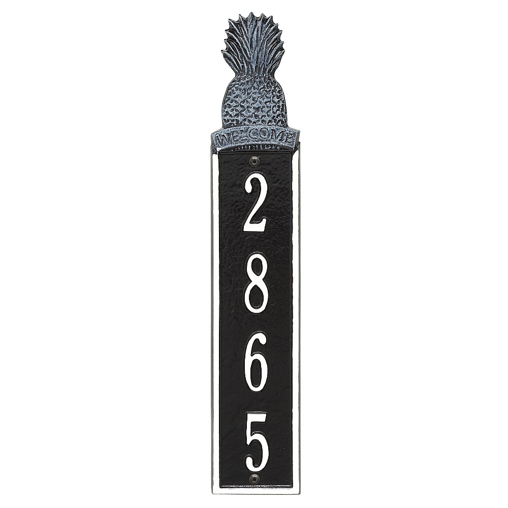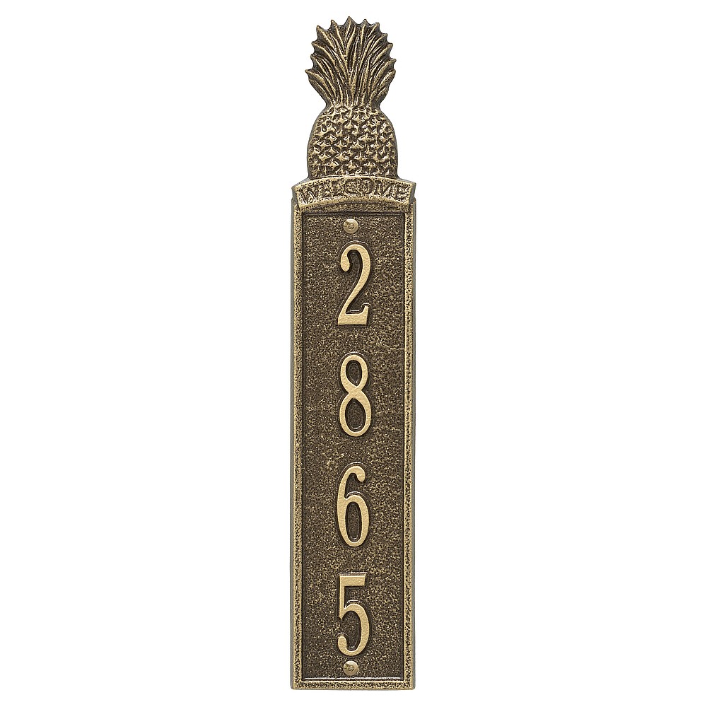 Dimensions (LxWxH): 16.75 x 3.2 x .375 Welcome guests to your home with the Whitehall Products Pineapple Vertical Address Plaque. This plaque will add the finishing touch to your home and instantly improve curb appeal. The Pineapple address plaque is made from rust-free cast aluminum providing excellent quality and durability. Made in the USA Cast from recycled aluminum – will not rust. Alumi-Shieldâ„¢ All Weather Coatings: A Whitehall Exclusive Enhances curb appeal while adding value to your home Personalization is permanently cast into the sign