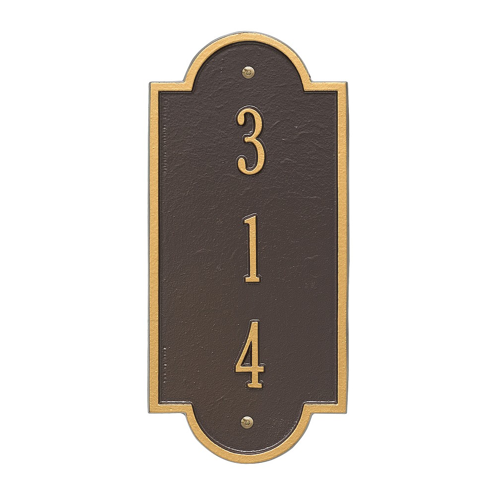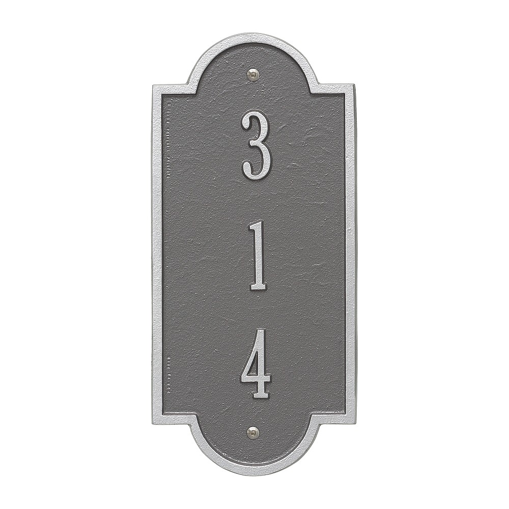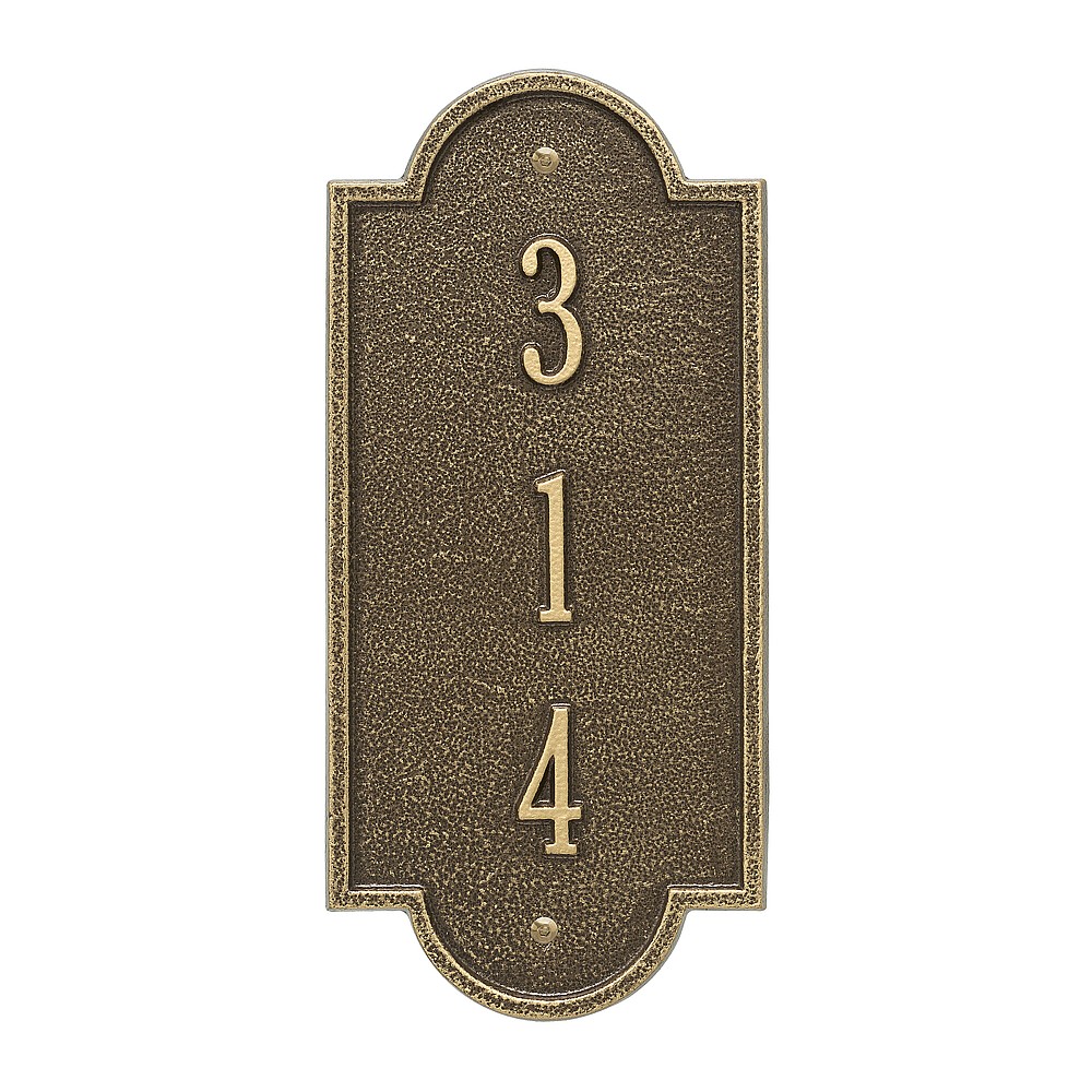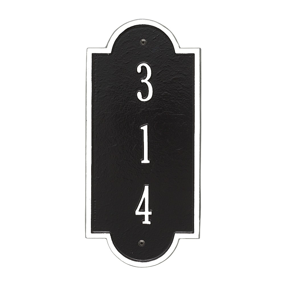 Dimensions (LxWxH): 13 x 6 x .375 The Whitehall Products Richmond Vertical Address Plaque will add the finishing touch to your home and instantly improve curb appeal. This address plaque is made from rust-free cast aluminum providing excellent quality and durability. Made in the USA Cast from recycled aluminum – will not rust. Alumi-Shieldâ„¢ All Weather Coatings: A Whitehall Exclusive Enhances curb appeal while adding value to your home Personalization is permanently cast into the sign