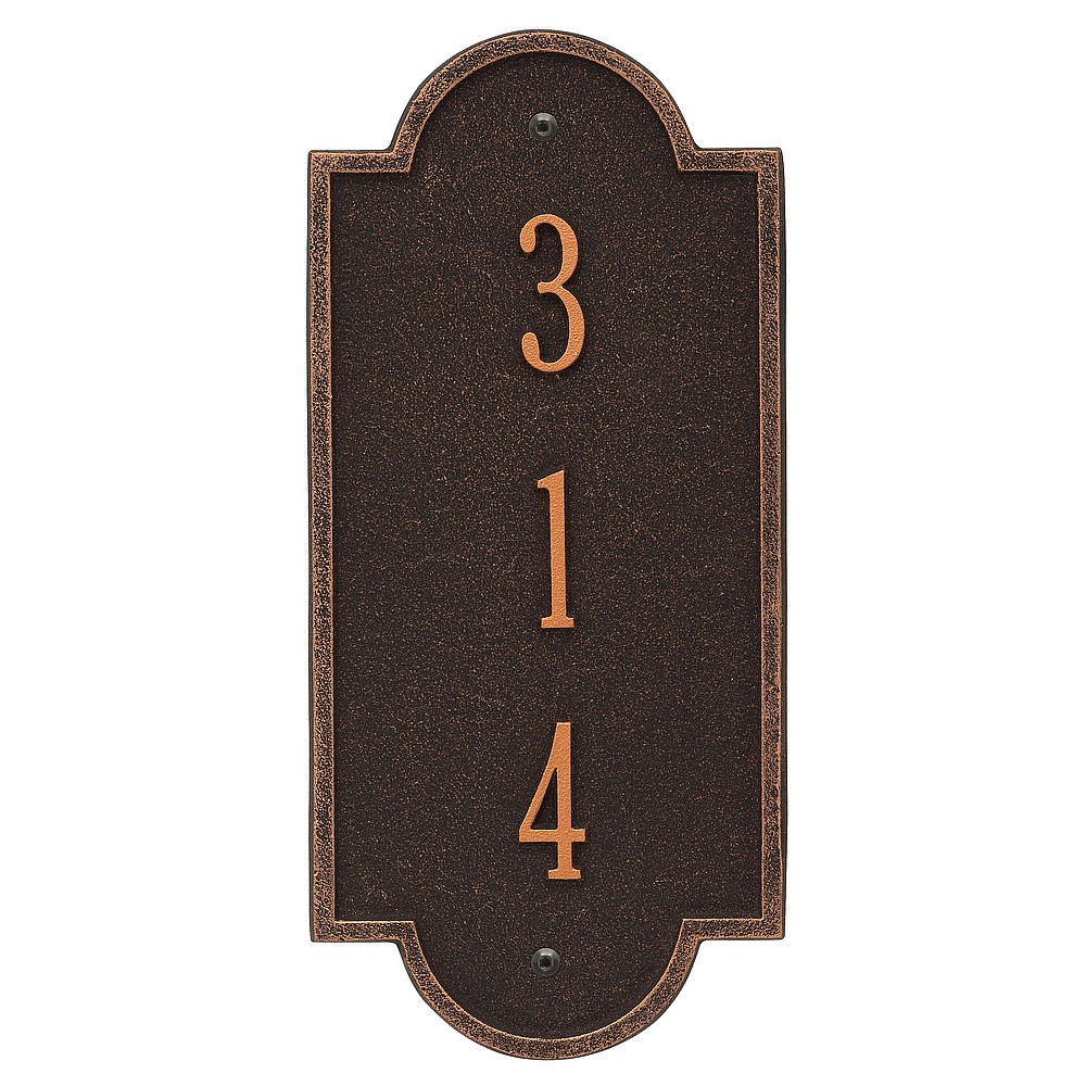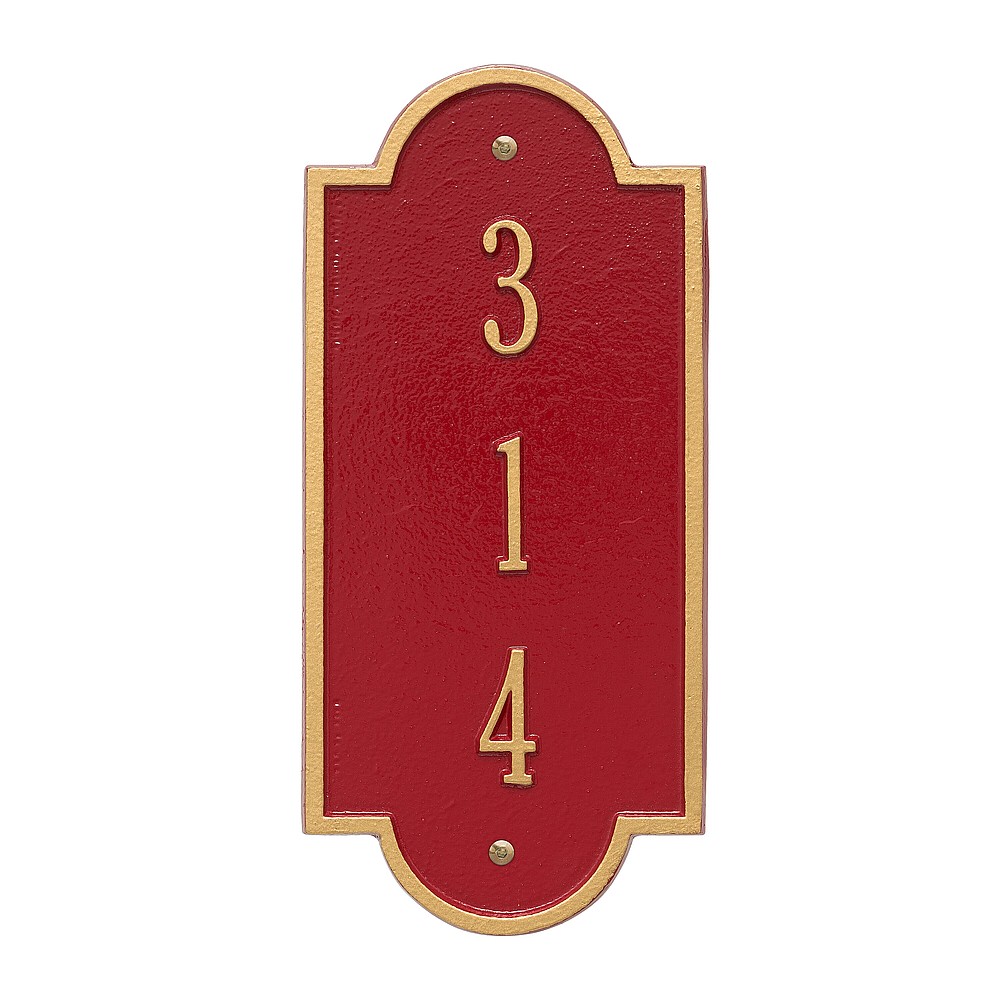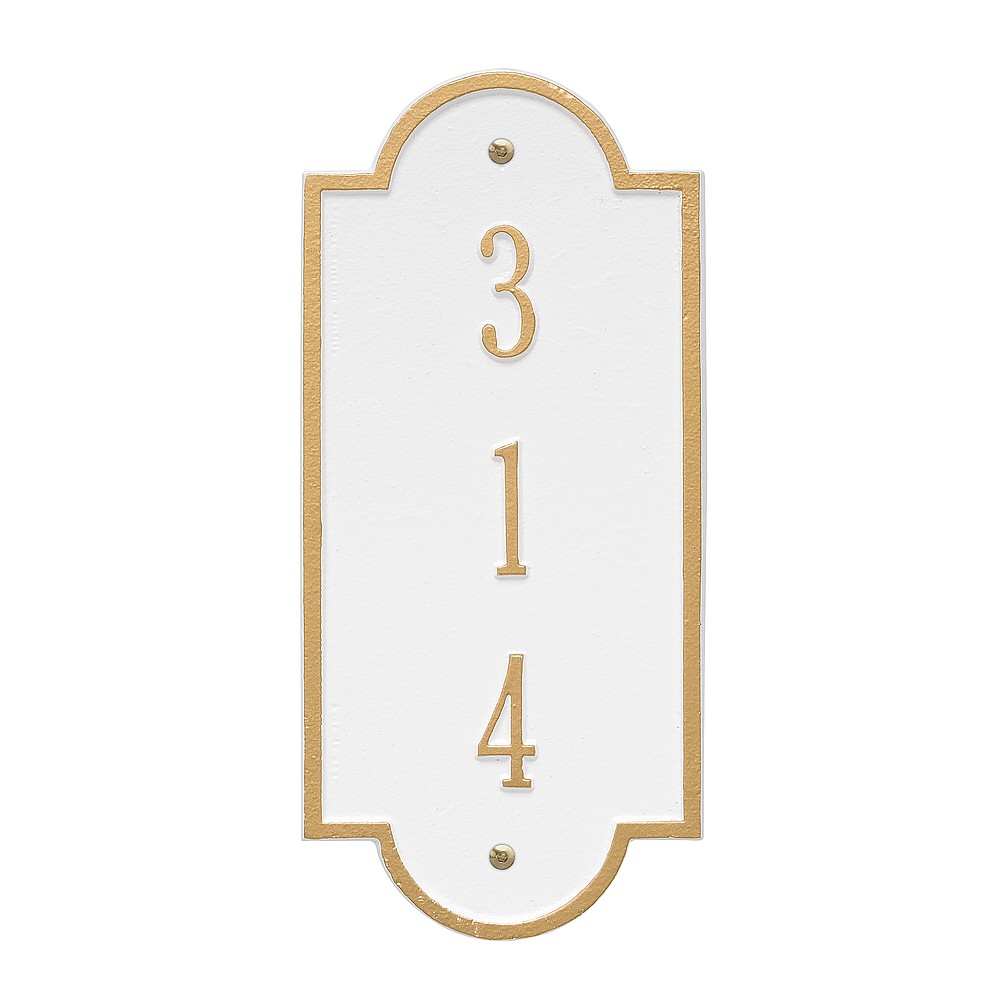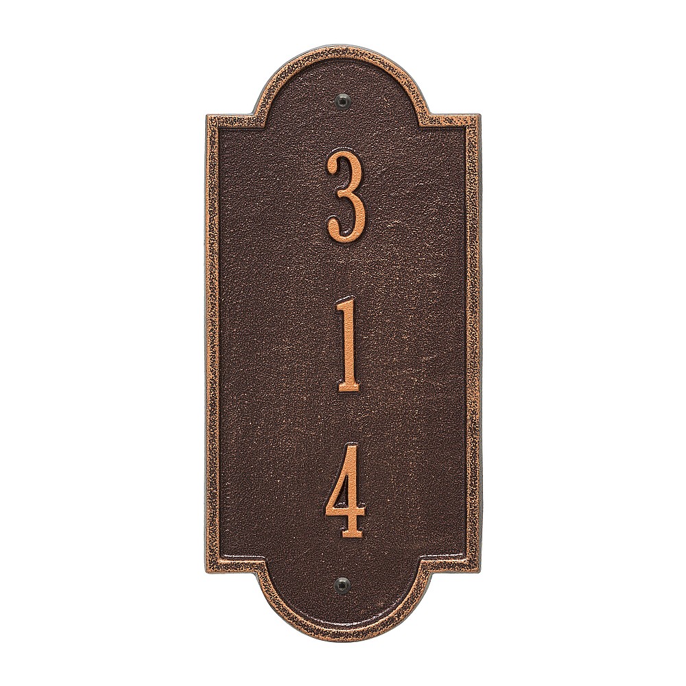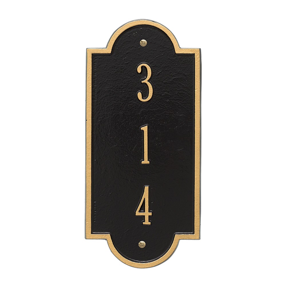 Dimensions (LxWxH): 13 x 6 x .375 The Whitehall Products Richmond Vertical Address Plaque will add the finishing touch to your home and instantly improve curb appeal. This address plaque is made from rust-free cast aluminum providing excellent quality and durability. Made in the USA Cast from recycled aluminum – will not rust. Alumi-Shieldâ„¢ All Weather Coatings: A Whitehall Exclusive Enhances curb appeal while adding value to your home Personalization is permanently cast into the sign