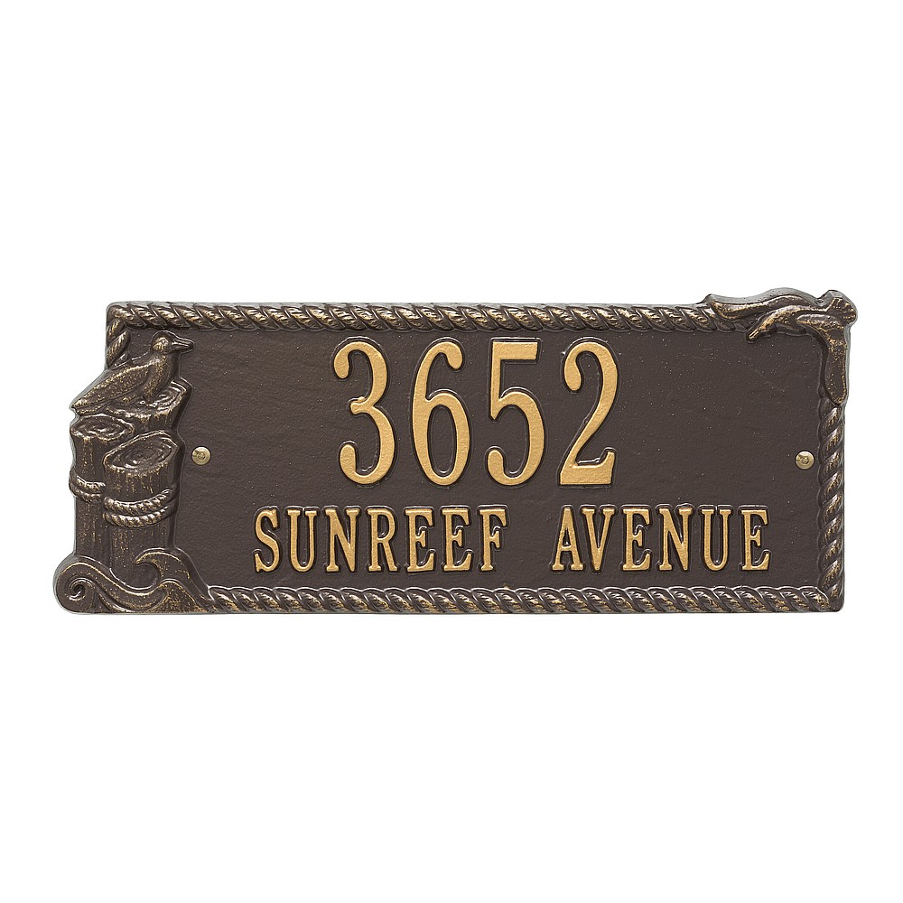 Dimensions (LxWxH): 16.5″ x 7″ x .375 This coastal style Seagull Rectangle Address Plaque is an attractive finishing touch for your home. Features a handmade, premium grade aluminum casting that showcases an intricate, detailed nautical design. Manufactured from cast, high-density aluminum alloy and protected by our exclusive Alumi-Shieldâ„¢ all weather coatings. Alumi-Shieldâ„¢ All Weather Coating: A Whitehall Exclusive Alumi-Shieldâ„¢ – Protects against the harshest weather and environmental elements. Extends the product life and maintains the look and function. Made in the USA.