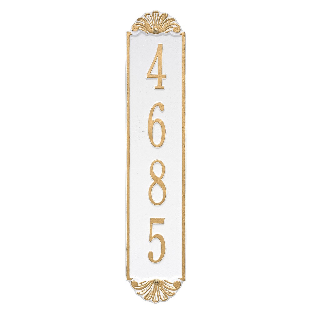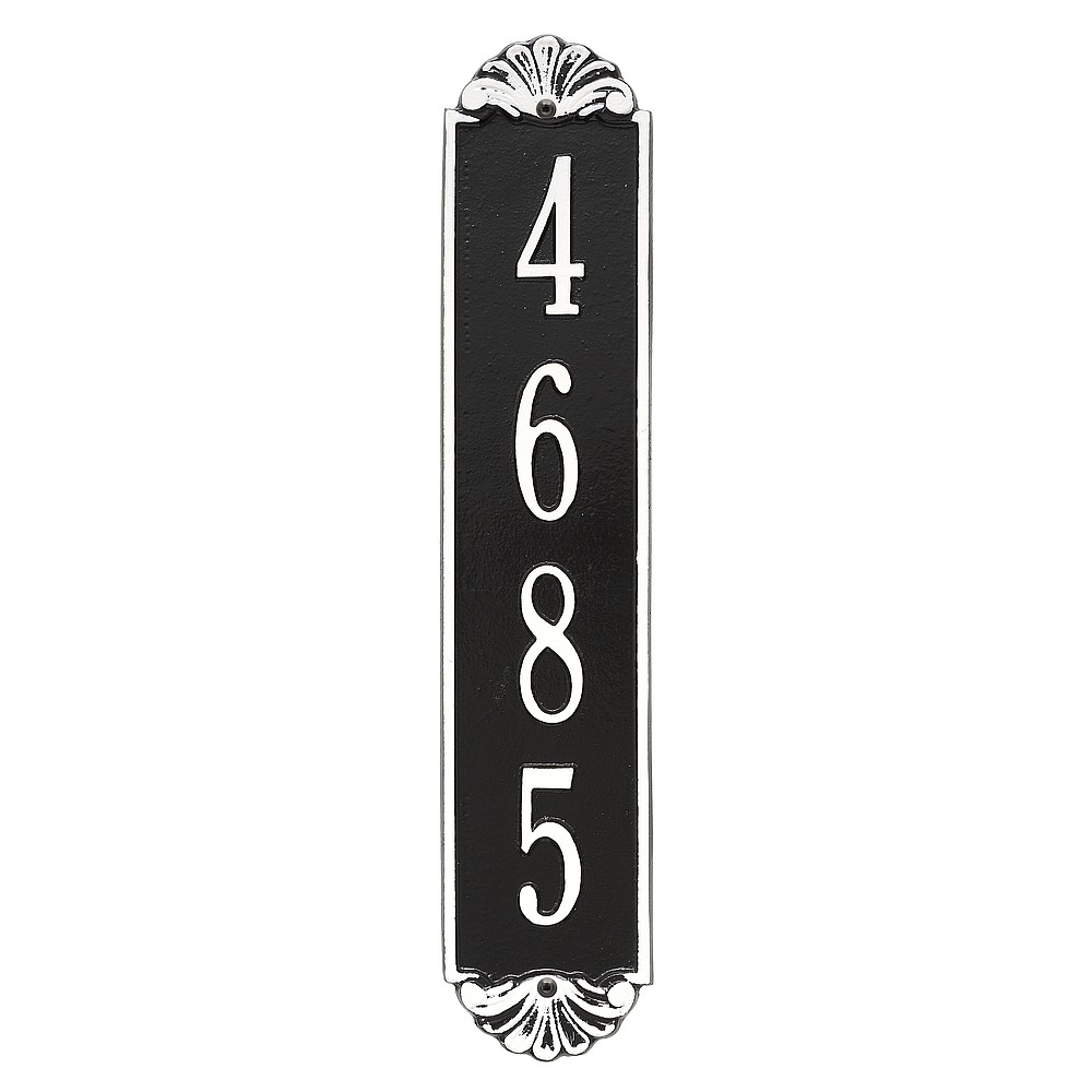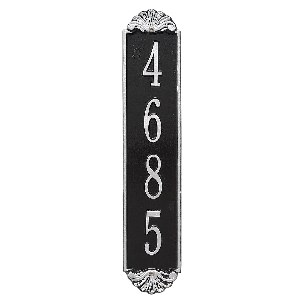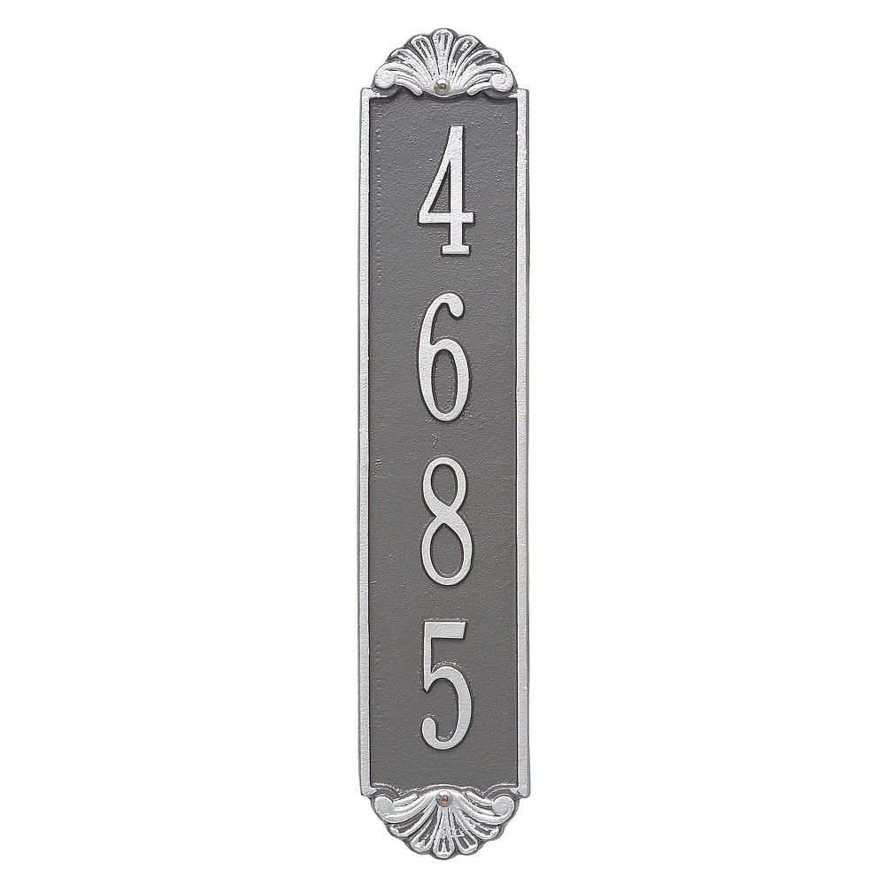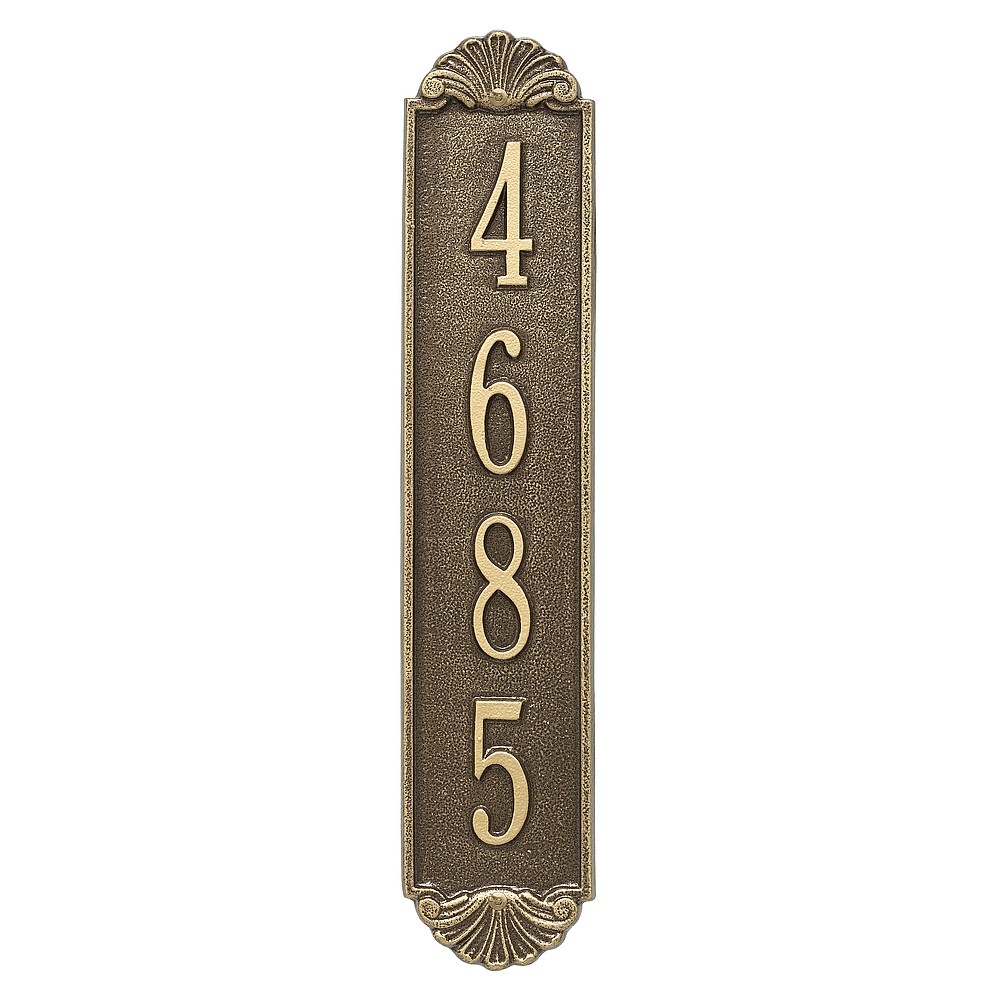 Dimensions (LxWxH): 19 x 4 x .375 The Whitehall Products Shell Vertical Address Plaque will add a nautical touch to your home and instantly improve curb appeal. This address plaque is made from rust-free cast aluminum providing excellent quality and durability. Made in the USA Cast from recycled aluminum – will not rust. Alumi-Shieldâ„¢ All Weather Coatings: A Whitehall Exclusive Enhances curb appeal while adding value to your home Personalization is permanently cast into the sign