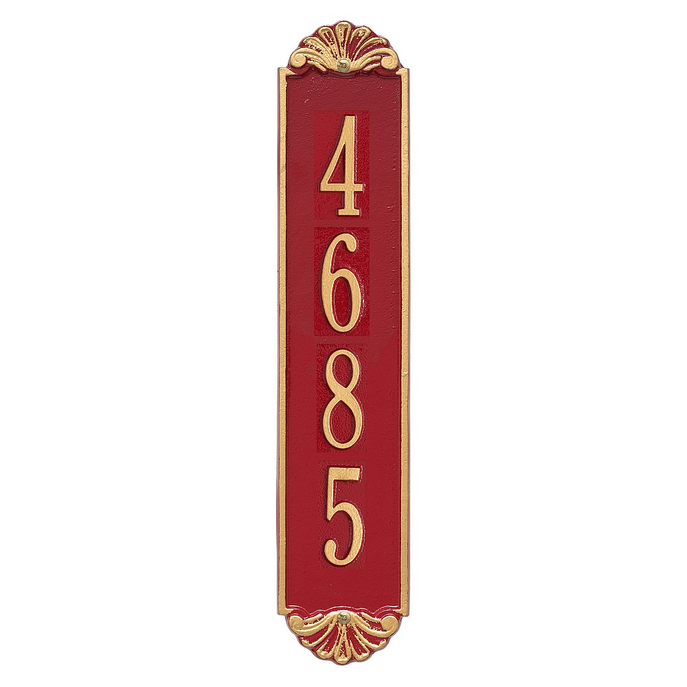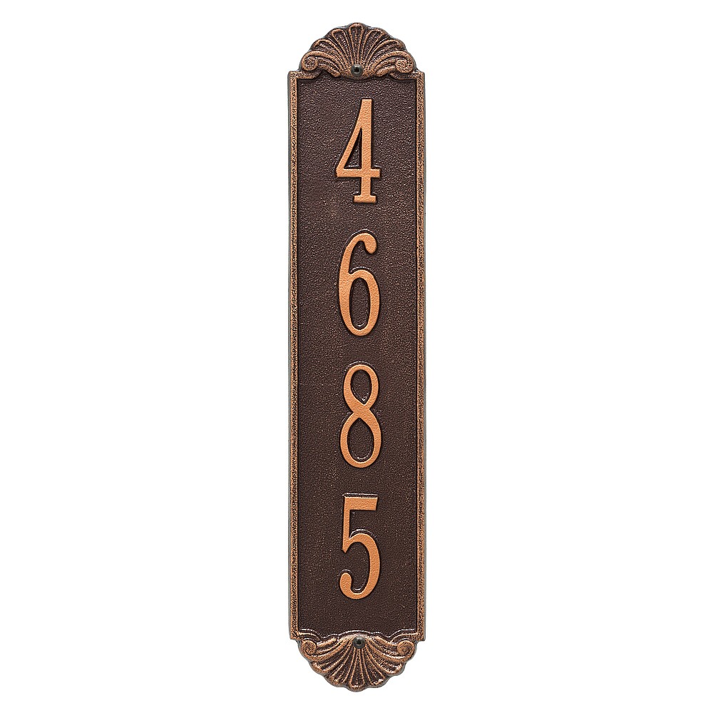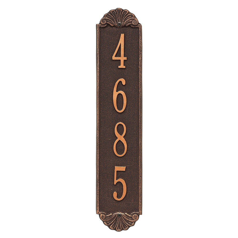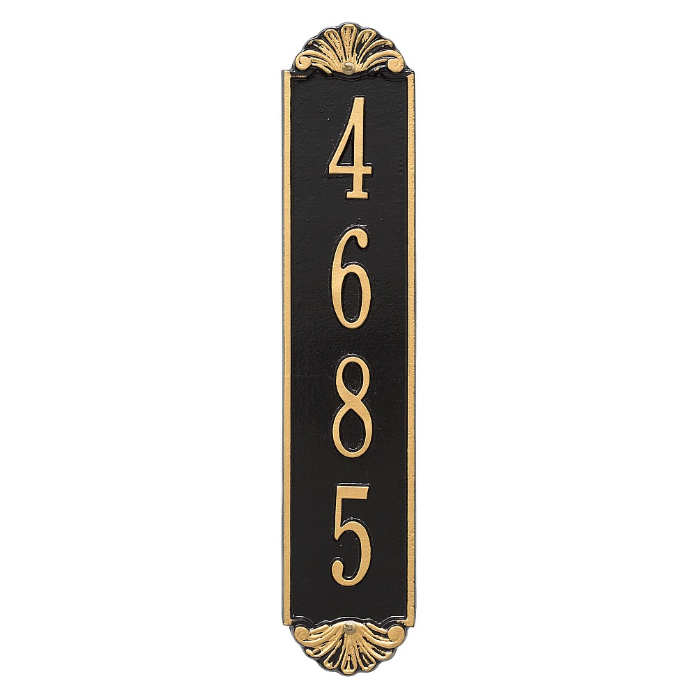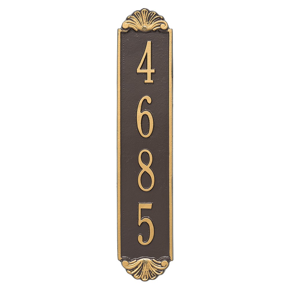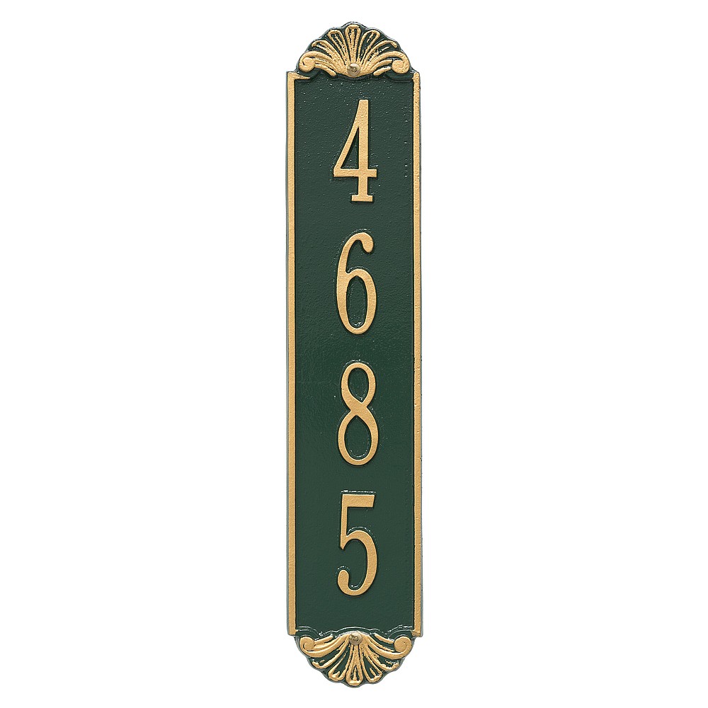Dimensions (LxWxH): 19 x 4 x .375 The Whitehall Products Shell Vertical Address Plaque will add a nautical touch to your home and instantly improve curb appeal. This address plaque is made from rust-free cast aluminum providing excellent quality and durability. Made in the USA Cast from recycled aluminum – will not rust. Alumi-Shieldâ„¢ All Weather Coatings: A Whitehall Exclusive Enhances curb appeal while adding value to your home Personalization is permanently cast into the sign