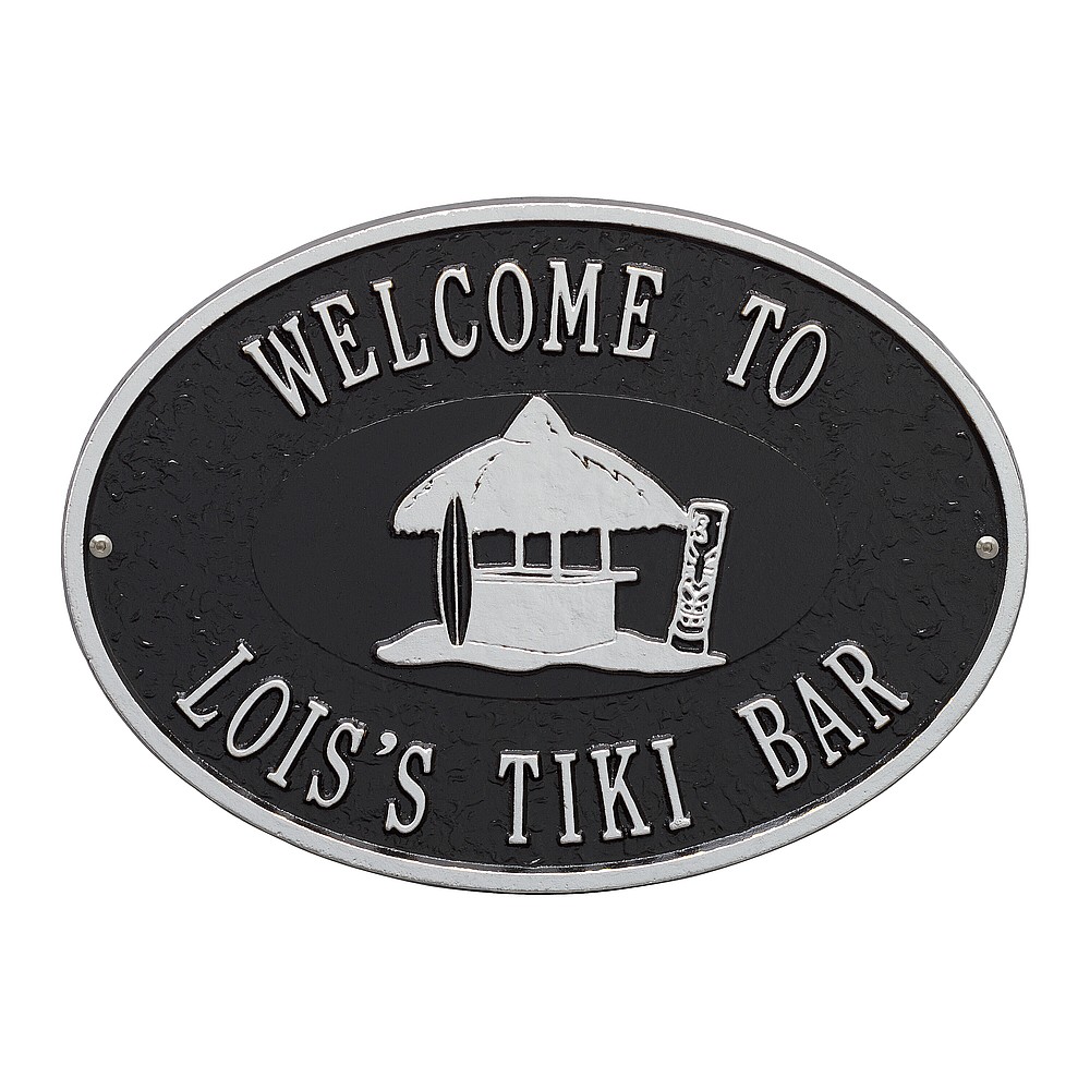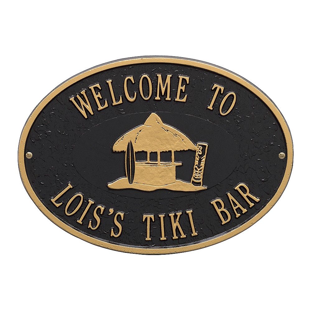 Dimensions (LxW): 14.25″ x 10.25″ Welcome everyone to your party spot with this personalized Tiki Hut wall plaque! Immediately upon arrival your guests will recognize it’s time to relax and enjoy the company. Made from environment friendly recycled aluminum these signs are weather resistant and will outlast any party you can throw. Each sign is custom made in the USA to your specifications giving you the ability to create the perfect greeting for your guests. Keep the party going at your patio, deck, or backyard and order your custom Tiki Hut sign today! Personalization is permanently cast into the sign. Manufactured from high-density cast aluminum alloy. Alumi-Shieldโ„ข All Weather Coating: A Whitehall Exclusive Alumi-Shieldโ„ข – Protects against the harshest weather and environmental elements. Extends the product life and maintains the look and function. Made in the USA.