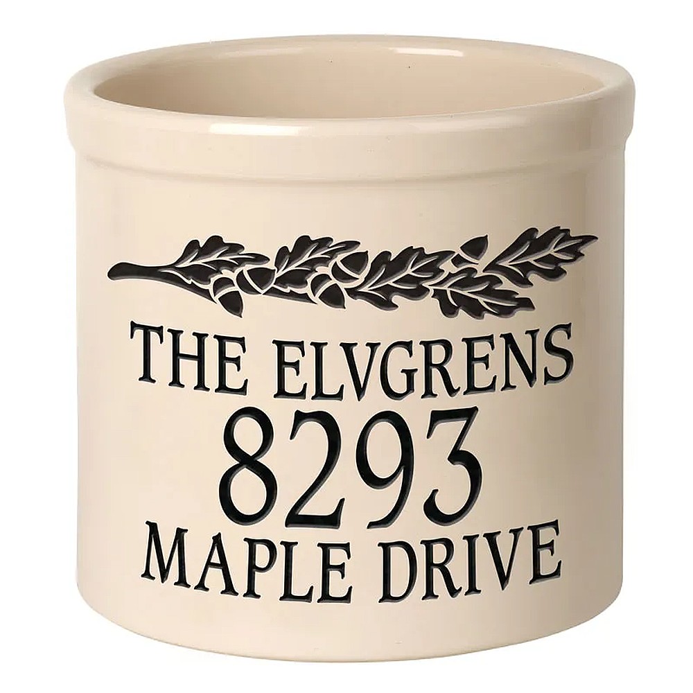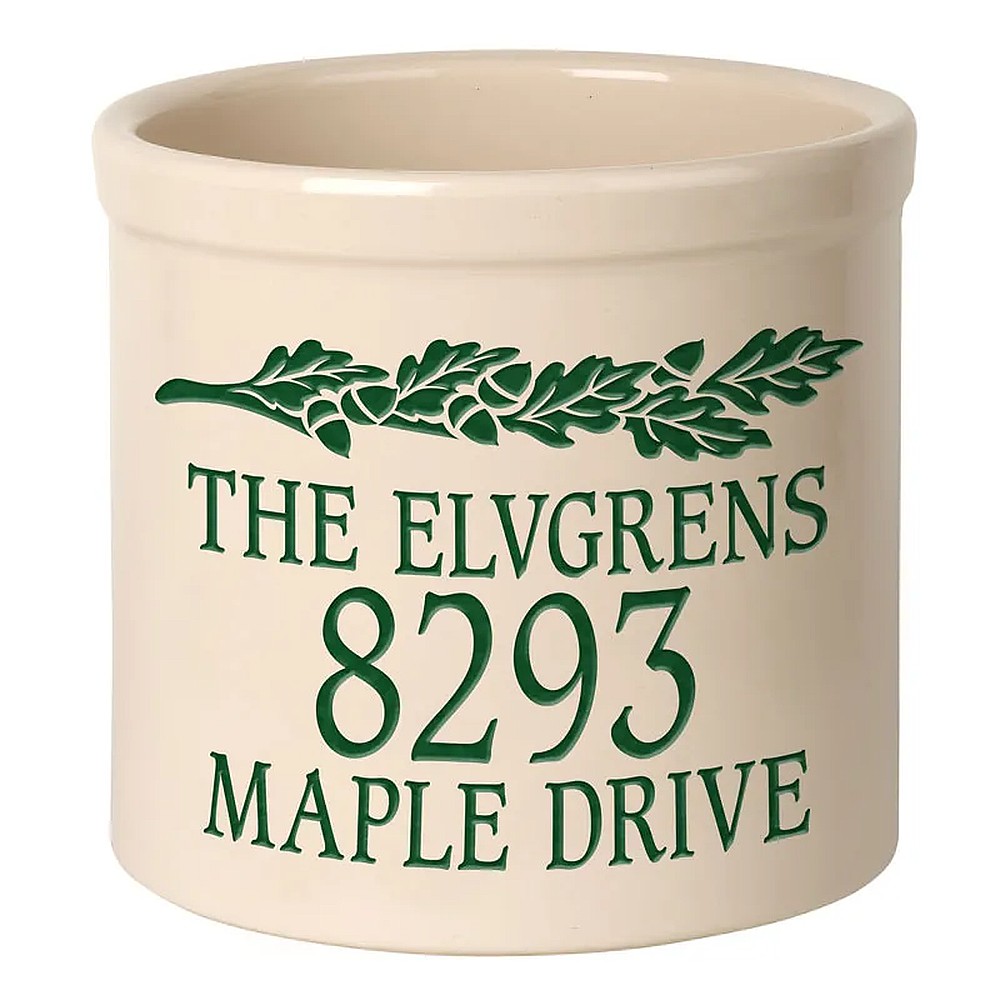 STORE SKU:Whitehall Personalized Top Center Oak Leaf 2 Gallon Stoneware Crock – 4 Options