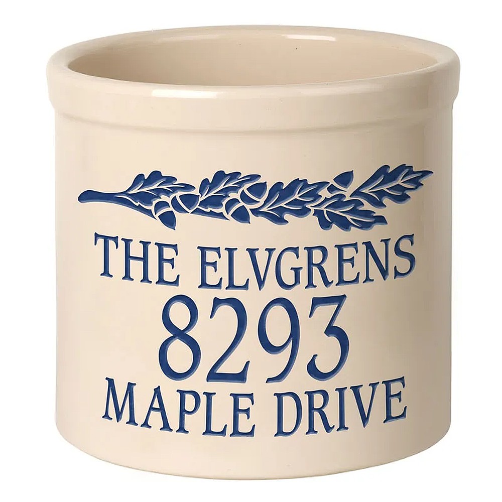 Assembled Dimensions (LxWxH): 9.75″ x 9.75″ x 9″ Whether your planting herbs and flowers, storing kitchen utensils or chilling beverages for a weekend gathering, these versatile two-gallon crocks are practical and personal adding a welcome addition to any abode. We will expertly carve your message to the surface of the crock, making a unique family heirloom that will be cherished through the years. Ideal uses: planter, ice bucket, door stop, magazine holder, utensil holder, house marker the possibilities are endless! Thoughtful and affordable solution for housewarming, wedding or anniversary gifts. Give your entryway a little personality when you use this personalized crock as a planter. Made-to-order, each of the crocks detailed design and personalization is deeply carved and then hand-painted with weather resistant finishes and glaze. Suitable for both indoor and outdoor use. Handcrafted in the USA from substantial and sturdy stoneware. A timeless piece to last for generations. Two-gallon, oversized crocks accommodate sizeable amounts of goods for storage. Crocks weigh a substantial 12 lbs., making for sturdy and durable storability. Hand wash. Avoid freezing.