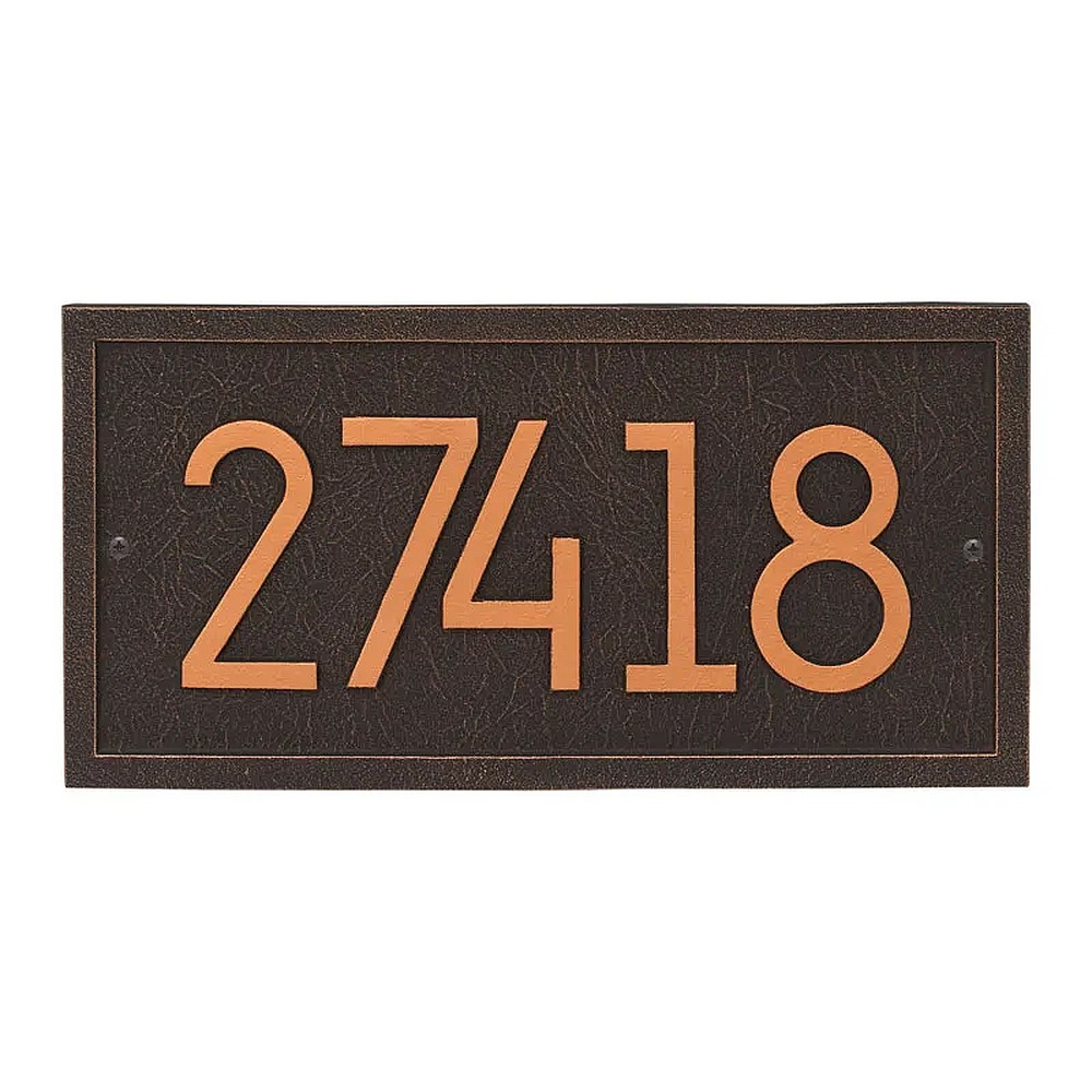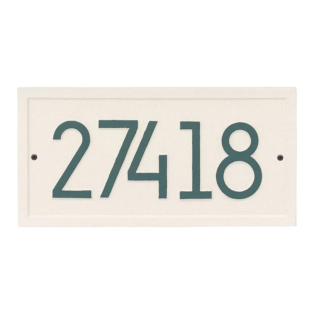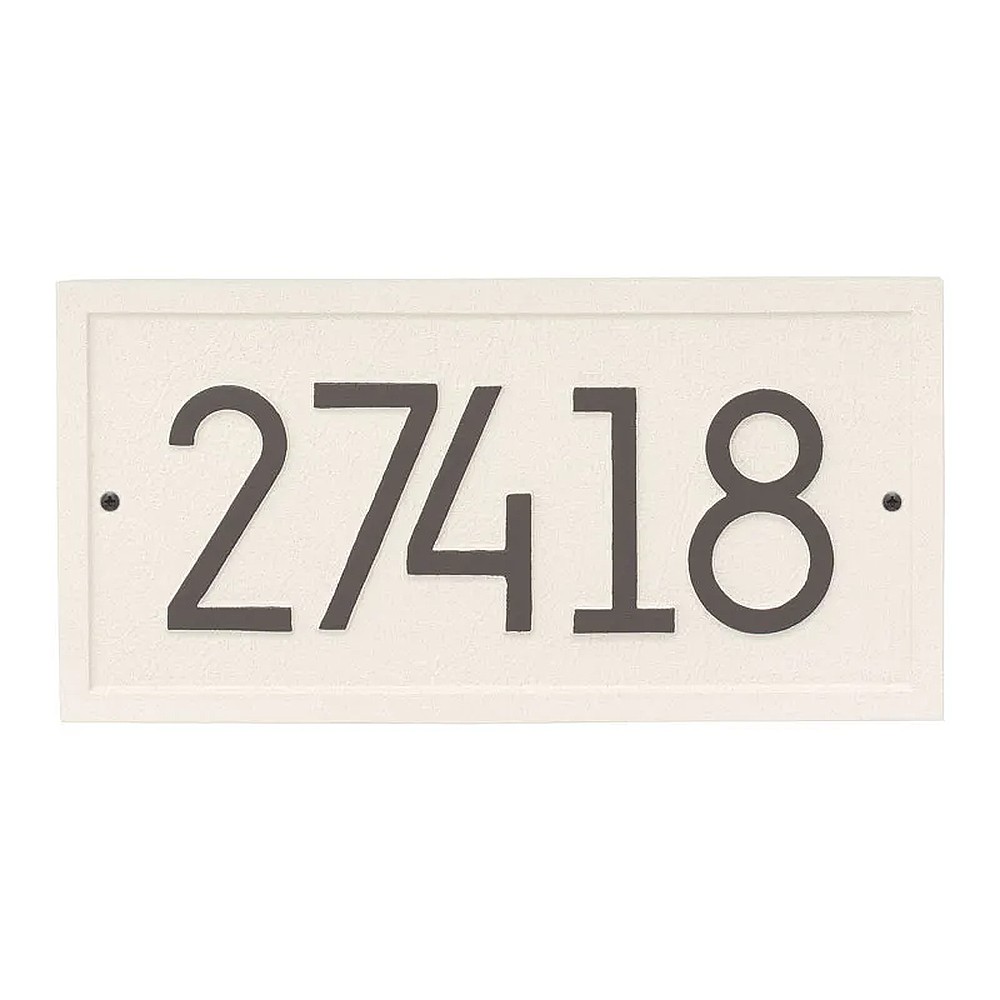 Dimensions (LxWxH): 14.75 x 7.5 x .325 Ramp up your curb appeal with the Rectangle Modern address plaque. The combination of a contemporary font and subtle border give this plaque its modern look. Whitehall address plaques are proudly handcrafted in the USA using American materials and labor. Whitehall address plaques are suitable for all exterior applications. Made in the USA Cast from recycled aluminum – will not rust. Alumi-Shieldâ„¢ All Weather Coatings: A Whitehall Exclusive Enhances curb appeal while adding value to your home