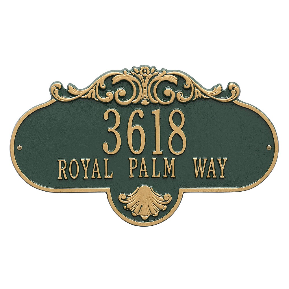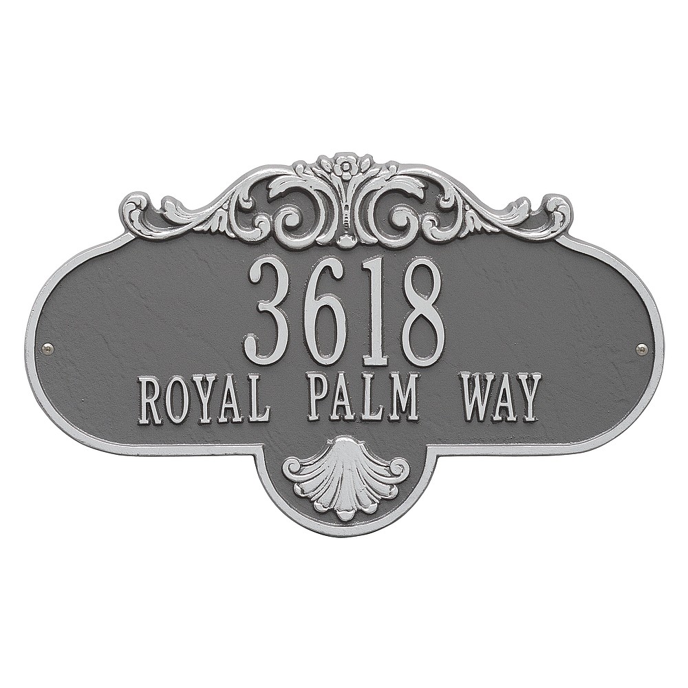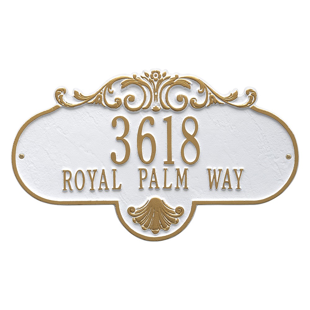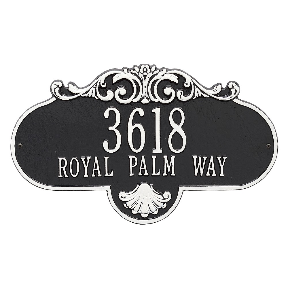 Line 1: 5 – 3″ characters Line 2: 17 – 1.25″ characters The Whitehall Products Rochelle Address Plaque ornately announces your address with a finely crafted scroll pattern Made in the USA Cast from recycled aluminum – will not rust. Alumi-Shield™ All Weather Coatings: A Whitehall Exclusive Enhances curb appeal while adding value to your home Personalization is permanently cast into the sign