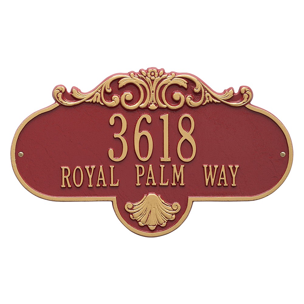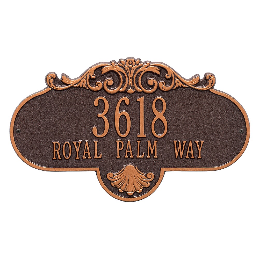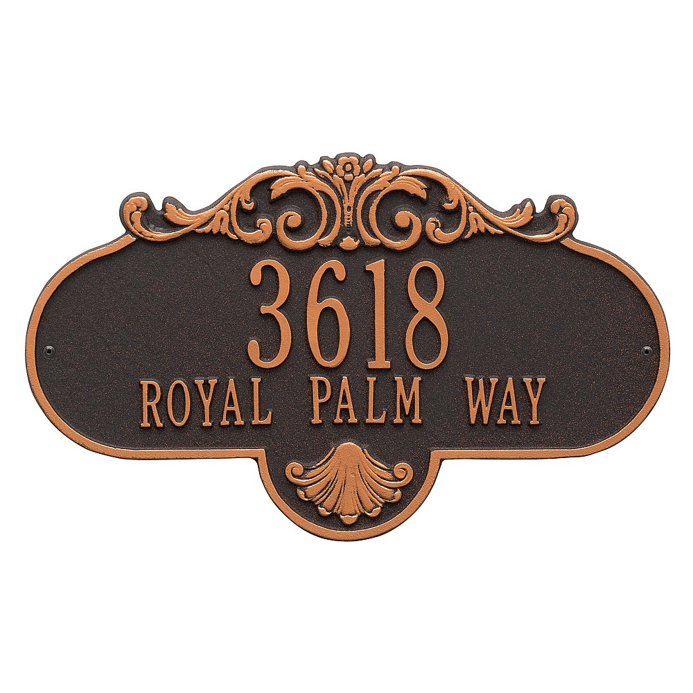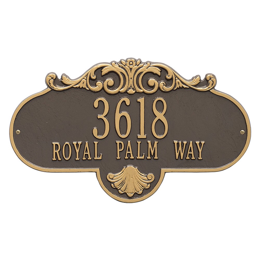 Line 1: 5 – 3″ characters Line 2: 17 – 1.25″ characters The Whitehall Products Rochelle Address Plaque ornately announces your address with a finely crafted scroll pattern Made in the USA Cast from recycled aluminum – will not rust. Alumi-Shield™ All Weather Coatings: A Whitehall Exclusive Enhances curb appeal while adding value to your home Personalization is permanently cast into the sign