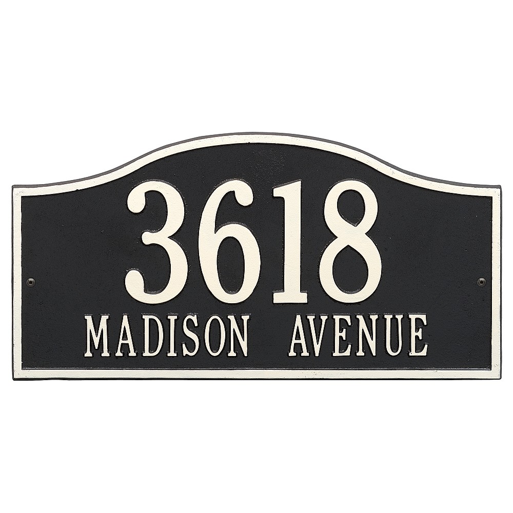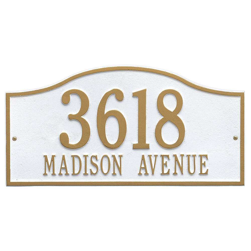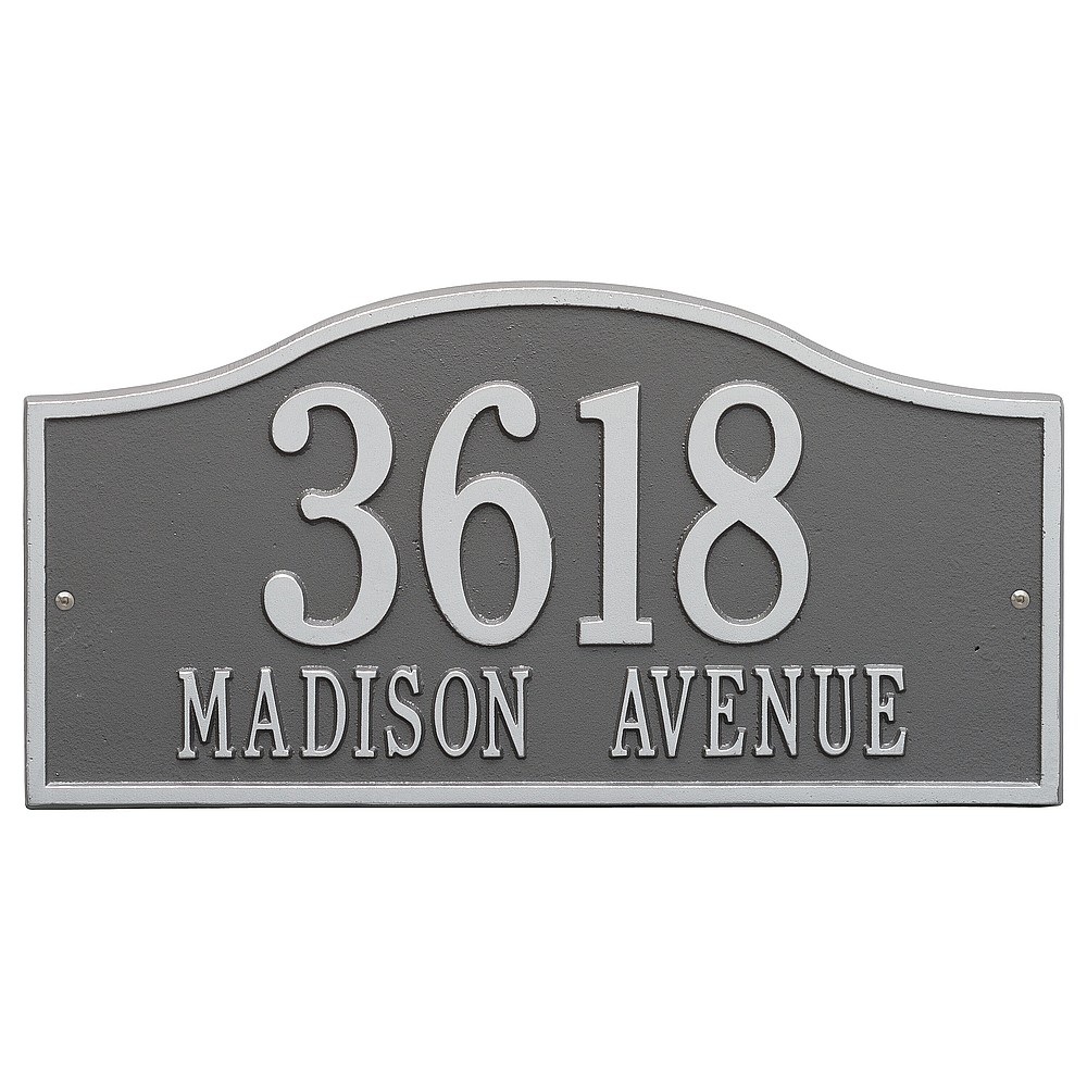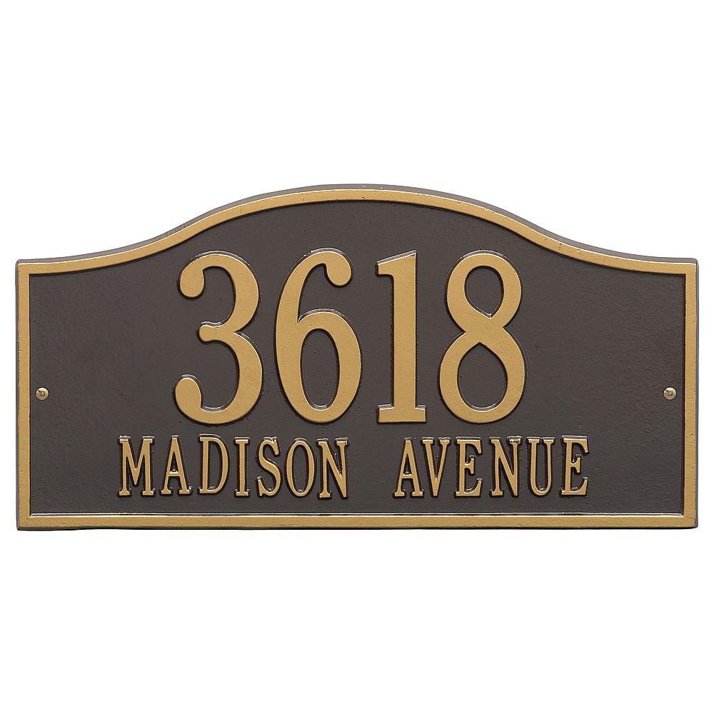 Line 1: 5 – 4.5″ characters Line 2: 17 – 1.5″ characters The Whitehall Products Rolling Hills Address Plaque is a simple yet classy way to display your address. This plaque has a soft flowing arch shape perfectly complimenting any home d�cor. Made in the USA Cast from recycled aluminum – will not rust. Alumi-Shield™ All Weather Coatings: A Whitehall Exclusive Enhances curb appeal while adding value to your home Personalization is permanently cast into the sign
