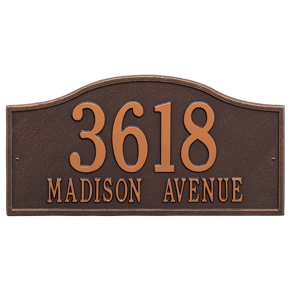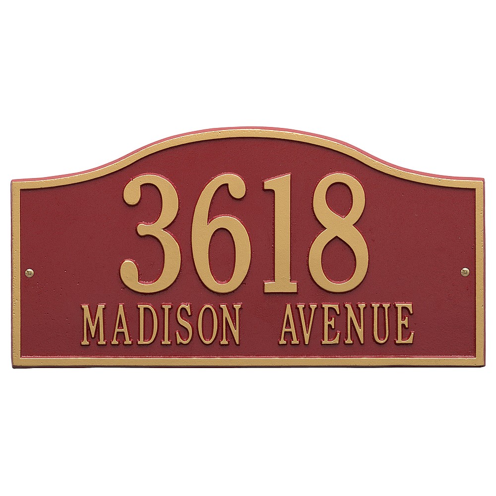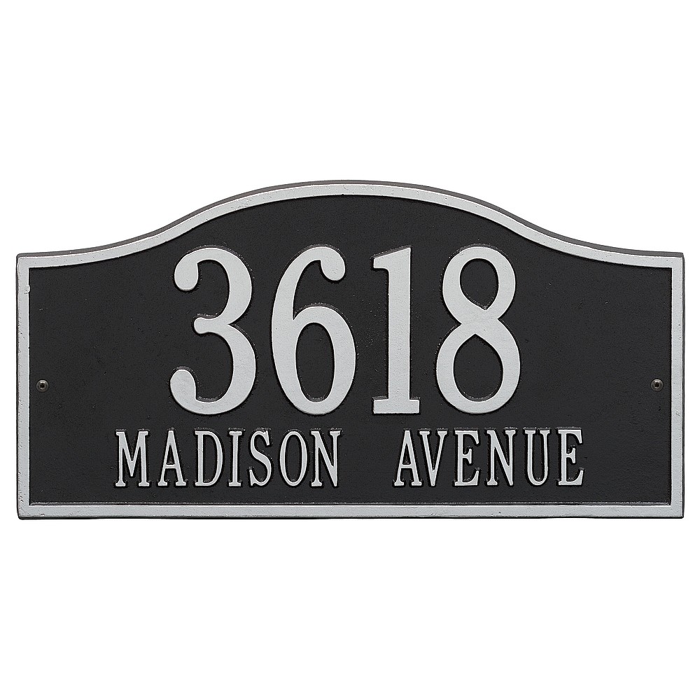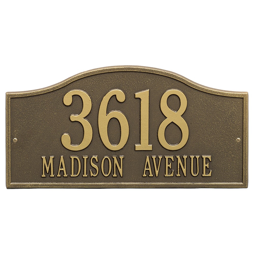 Line 1: 5 – 4.5″ characters Line 2: 17 – 1.5″ characters The Whitehall Products Rolling Hills Address Plaque is a simple yet classy way to display your address. This plaque has a soft flowing arch shape perfectly complimenting any home d�cor. Made in the USA Cast from recycled aluminum – will not rust. Alumi-Shield™ All Weather Coatings: A Whitehall Exclusive Enhances curb appeal while adding value to your home Personalization is permanently cast into the sign