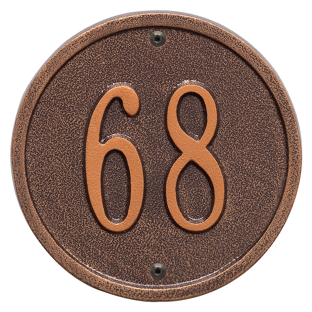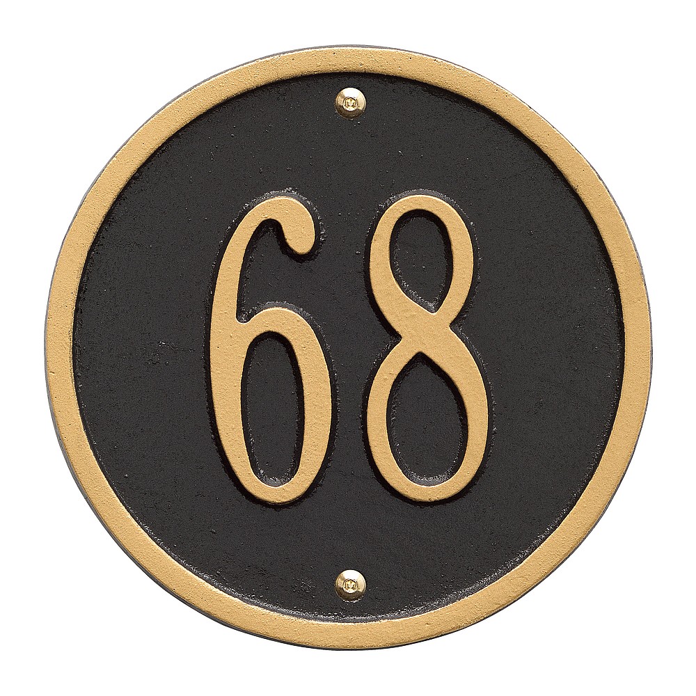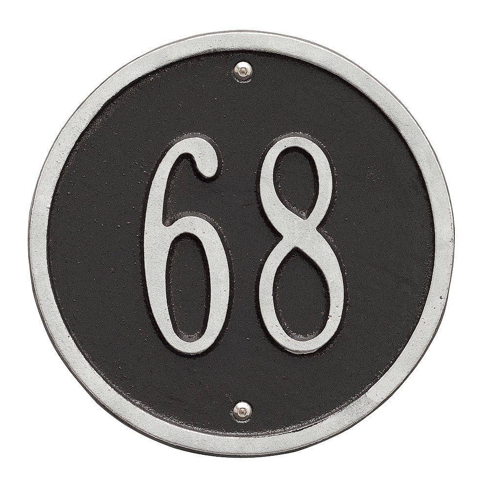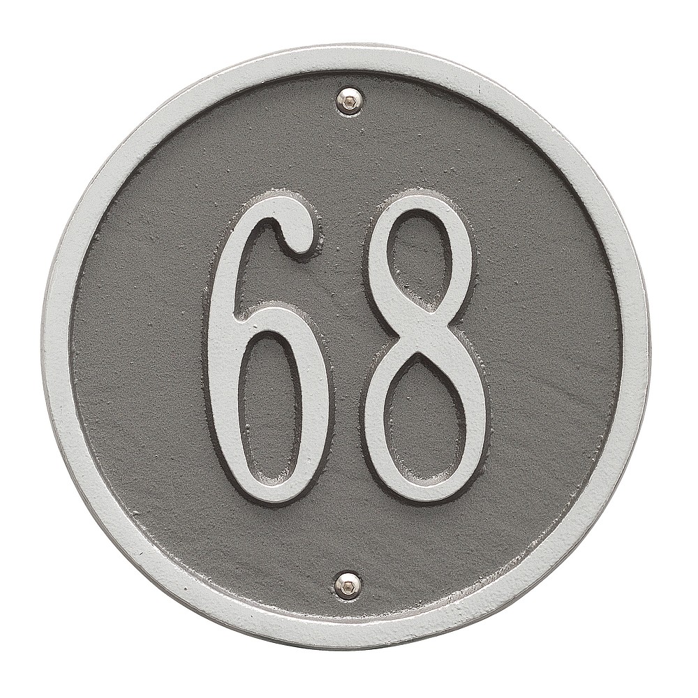 3 – 3″ characters The Whitehall Products 6″ Round Address Plaque is a simple yet classy way to display your address. The address plaque is made from rust-free cast aluminum providing excellent quality. Made in the USA Cast from recycled aluminum – will not rust. Alumi-Shield™ All Weather Coatings: A Whitehall Exclusive Enhances curb appeal while adding value to your home Personalization is permanently cast into the sign