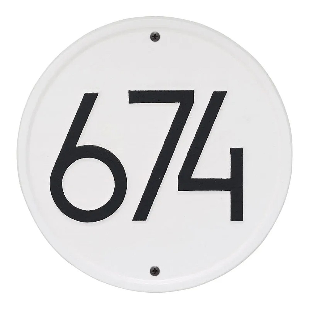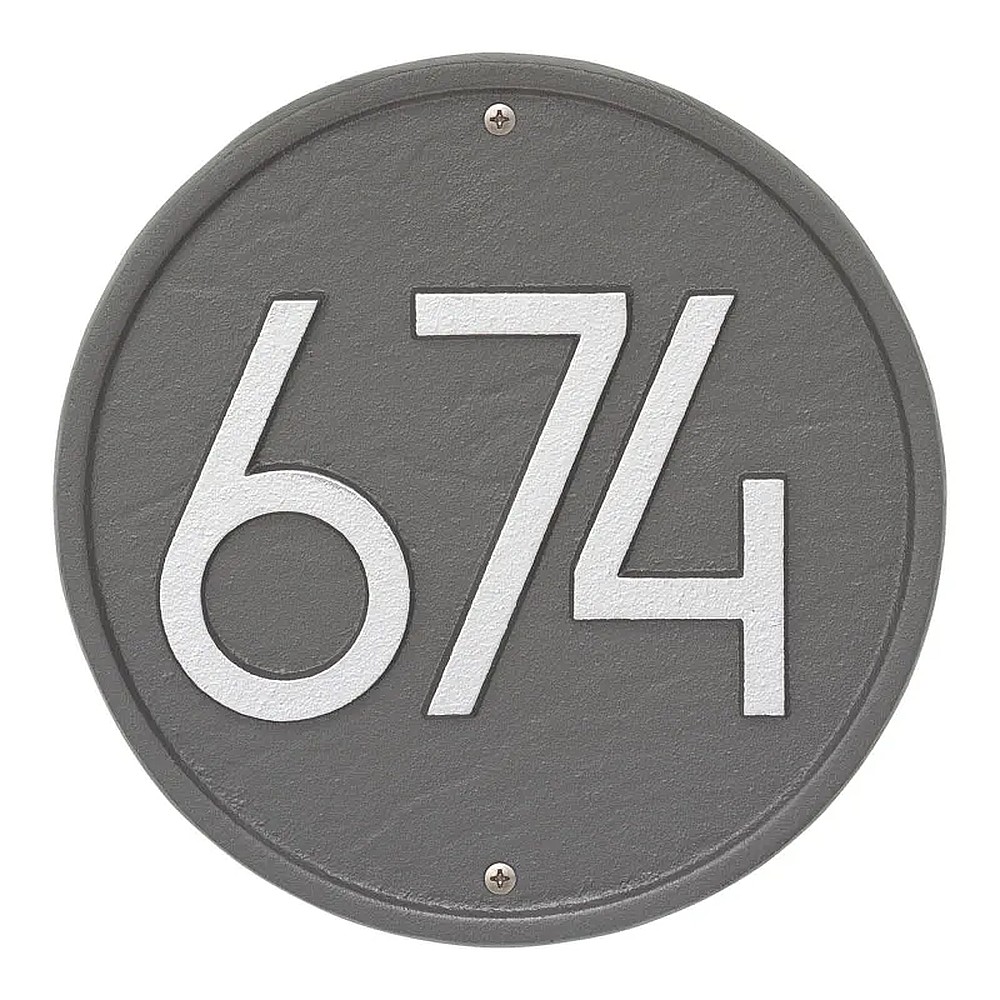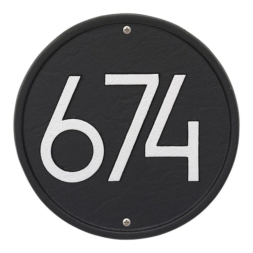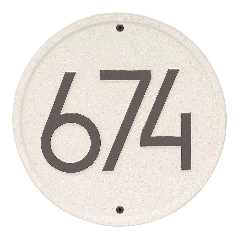Dimensions (LxWxH): 8.75 x 8.75 x .325 Ramp up your curb appeal with the Round Modern address plaque. The combination of a contemporary font and subtle border give this plaque its modern look. Whitehall address plaques are proudly handcrafted in the USA using American materials and labor. Whitehall address plaques are suitable for all exterior applications. Made in the USA Cast from recycled aluminum – will not rust. Alumi-Shieldâ„¢ All Weather Coatings: A Whitehall Exclusive Enhances curb appeal while adding value to your home