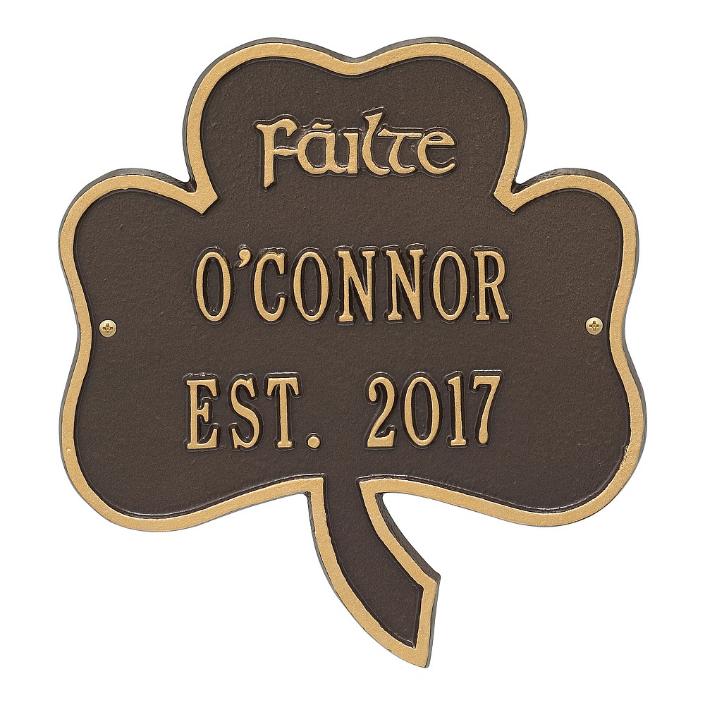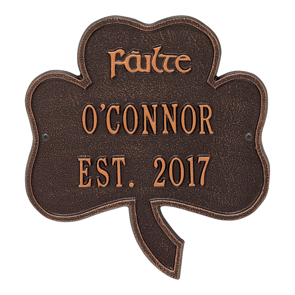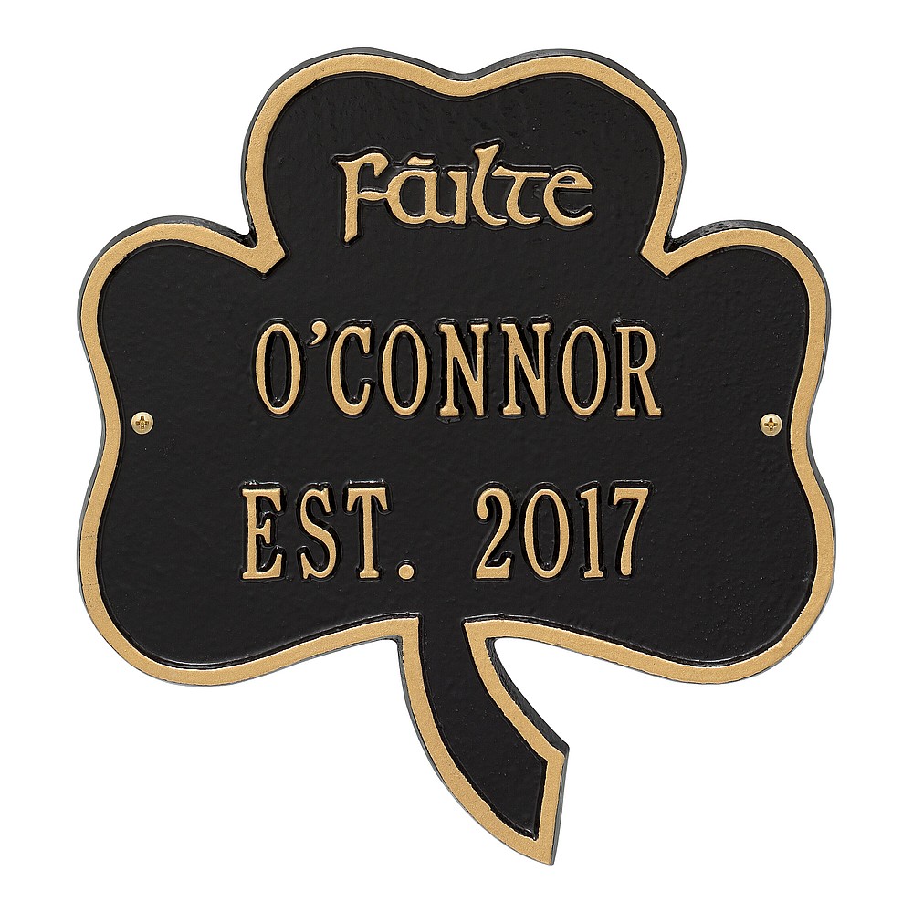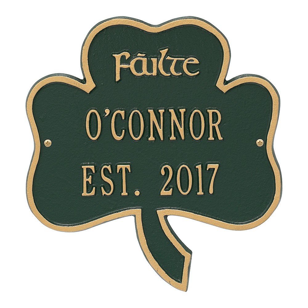Dimensions (LxWxH): 10 x 11.25 The Shamrock Address Plaque is the perfect way to welcome guests to your home. F ilte in Gaelic means literally that, Welcome! The three leaves of a shamrock are also said to stand for faith, hope and love. Features a handmade, premium grade aluminum casting that showcases an intricate, detailed Irish design. Manufactured from cast, high-density aluminum alloy and protected by our exclusive Alumi-Shieldâ„¢ all weather coatings. Alumi-Shieldâ„¢ All Weather Coating: A Whitehall Exclusive Alumi-Shieldâ„¢ – Protects against the harshest weather and environmental elements. Extends the product life and maintains the look and function. Made in the USA.