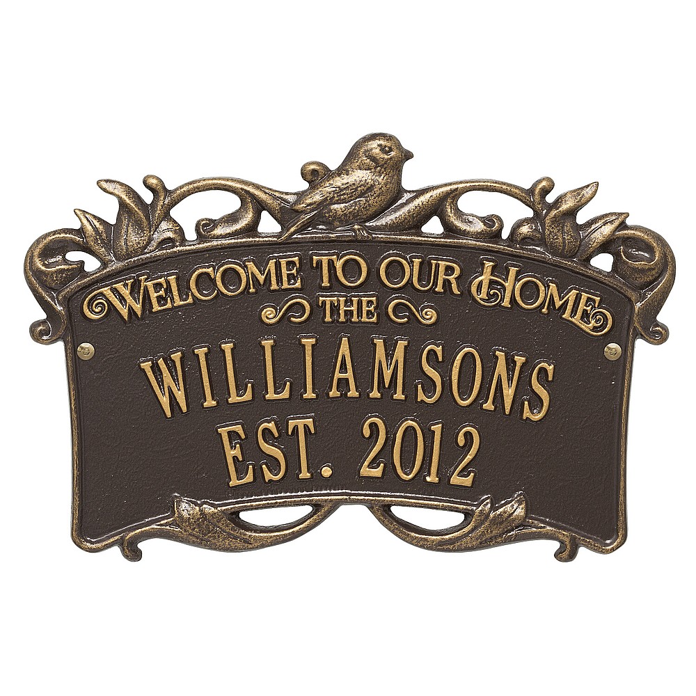 Dimensions (LxWxH): 14.25″ x 9.5″ x .34″ Dimensions (LxWxH): 14.25″ x 9.5″ x .34″ This beautiful silhouetted Bird and Branch design with large ribbon shape welcomes friends to your home. Space for Family name and established date. A Personalized plaque is a perfect gift to commemorate all of life’s celebrations. Makes a great personalized wedding, anniversary, or house warming gift. Handcrafted aluminum plaque for indoor or outdoor use. The words “welcome to our home” and “the” are a permanent part of the design. Alumi-Shieldâ„¢ – Protects against the harshest weather and environmental elements. Extends the product life and maintains the look and function. Made in the USA. A Personalized plaque is a perfect gift to commemorate all of life’s celebrations. Makes a great personalized wedding, anniversary, or house warming gift. Handcrafted aluminum plaque for indoor or outdoor use. The words “welcome to our home” and “the” are a permanent part of the design. Alumi-Shieldâ„¢ – Protects against the harshest weather and environmental elements. Extends the product life and maintains the look and function. Made in the USA.