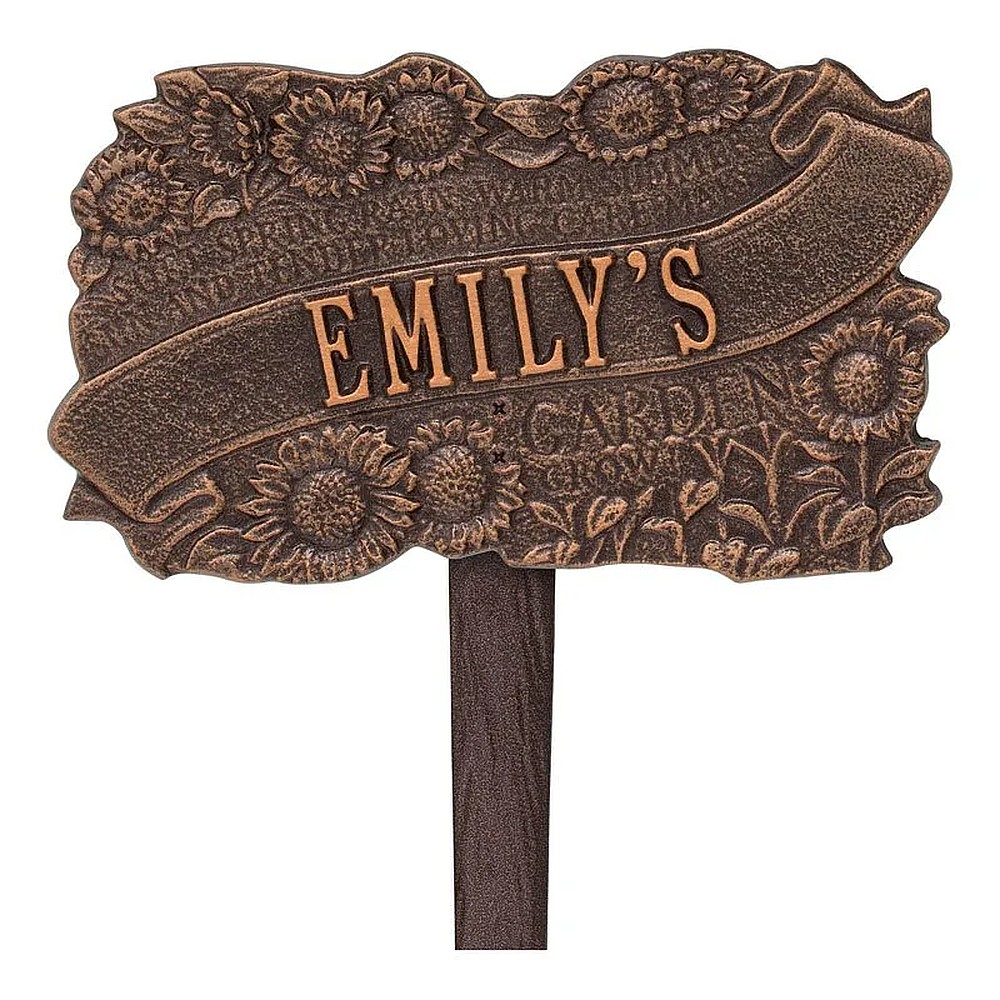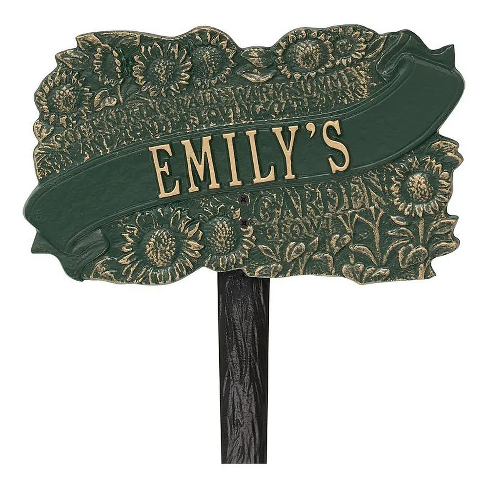 Assembled Dimensions Includes Stake (LxWxH): 10.5″ x 15″ x 2.75″ This elegantly carved garden plaque features detailed sunflowers alongside a quote which shares the love and care that goes into any garden. The TLC Garden Personalized Lawn Plaque is the perfect ornament to beautify any garden. Personalization is cast directly onto the plaque. “Soft spring rain, warm summer and tender loving care make [PERSONALIZATION] garden grow.” Proudly made in the USA. Includes one 10″ angled lawn stake. Manufactured from recycled aluminum. Alumi-Shieldâ„¢ – Protects against the harshest weather and environmental elements. Extends the product life and maintains the look and function.