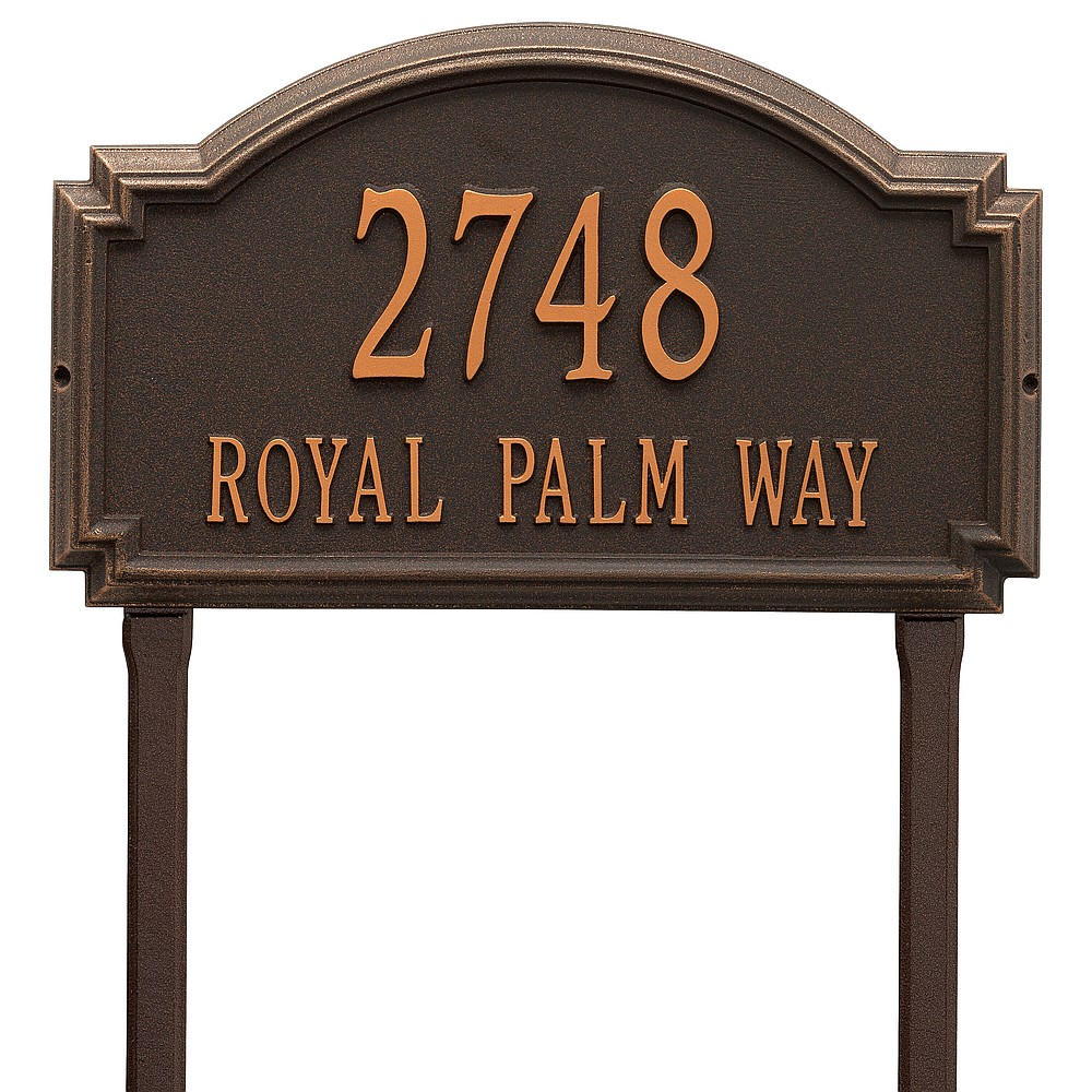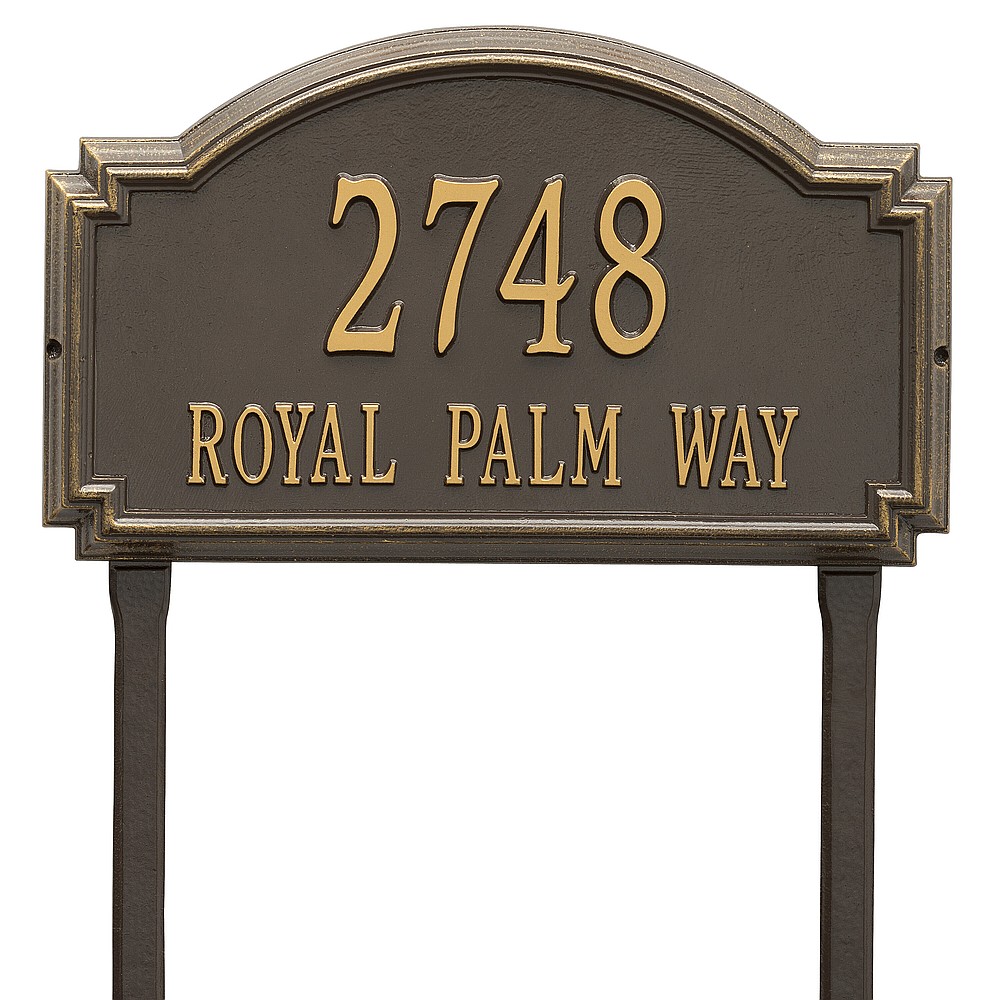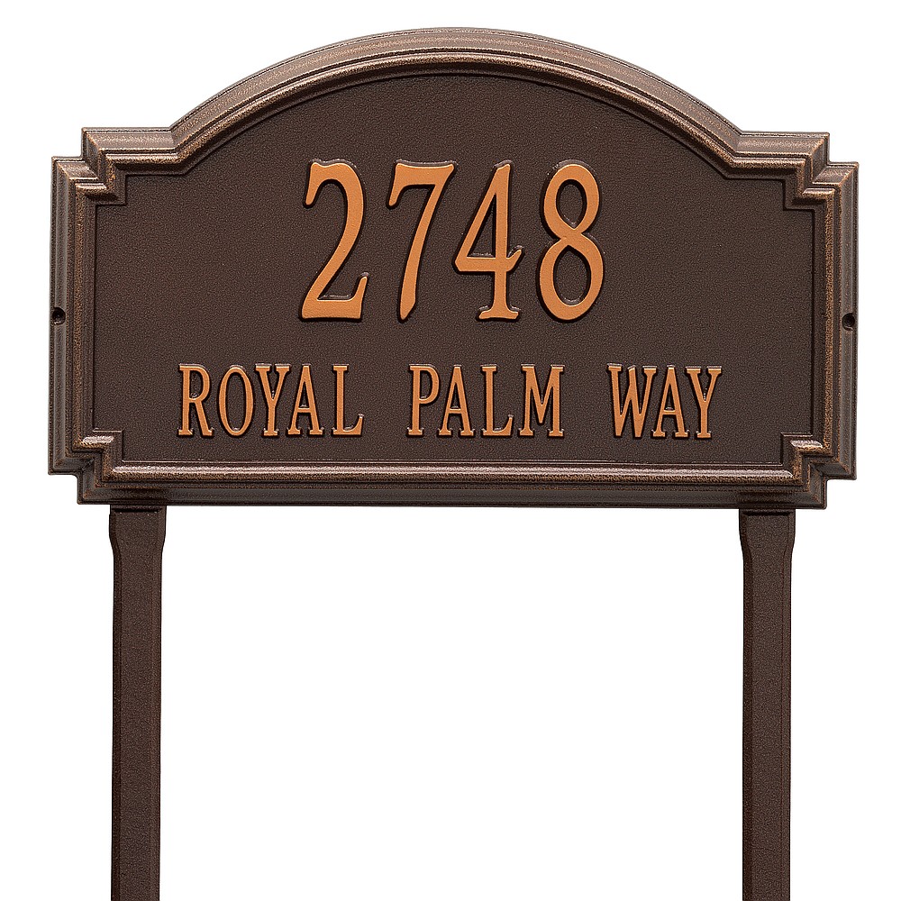 Line 1: 5 – 4″ numbers Line 2: 17 – 1.75″ characters The high relief frame of the Williamsburg house number plaque provides a distinctive appearance that helps your entryway to stand out from the rest. Add this beautiful Home address plaque to your list of gift ideas for any occasion. Made in the USA Cast from recycled aluminum – will not rust. Alumi-Shield™ All Weather Coatings: A Whitehall Exclusive Enhances curb appeal while adding value to your home Personalization is permanently cast into the sign