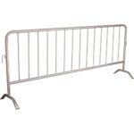 Ideal for directing people in areas where crowd control is required, Rugged welded steel construction, Feet are removable so railing will lay flat for shipping and storage, Includes connectors to attach multiple units together, Distance between vertical bars is 7″