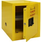 Double-wall 18-gauge welded steel construction with 1-1/2″ air space, Dual 2″ capped vents with flame arrestors, Full-H piano hinges open a full 180� for easy access, Recessed handle, 2″ high leak proof door sill, All shelves are adjustable on 2-1/2″ centers, Adjustable leveling feet, Tough corrosive resistant finish, Meets NFPA Code 30 and OSHA standard 1910 106 for storage for class I, II and III liquids