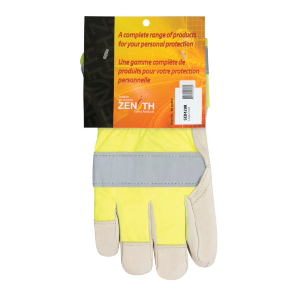 Premium construction, superior quality, 100-g Thinsulate liner provides superior warmth, Superior abrasion resistance, Excellent comfort and durability, Resists oil and water well, Full leather tipped fingers and knuckle strap, Fluorescent yellow back and two gray reflective stripes offer maximum visibility, Rubberized safety cuff