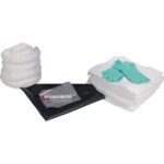 50 Sorbent Pads (15″ x 17″), 4 Sorbent Socks (3″ x 48″), 1 Drain Cover (36″ x 36″), 1 Repair Putty (4 oz.), 2 Pairs Nitrile Gloves, XL (10), 5 Disposal Bags (26″ x 36″)
