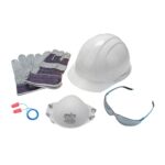 – Includes: White hard hat; safety glasses; work gloves; ear plugs; respirator